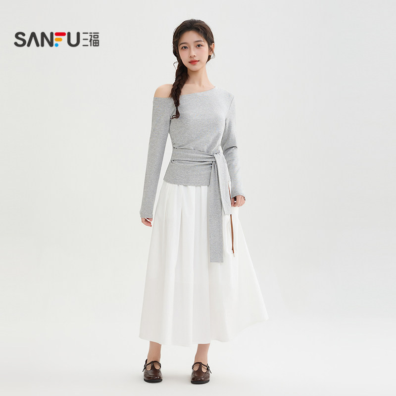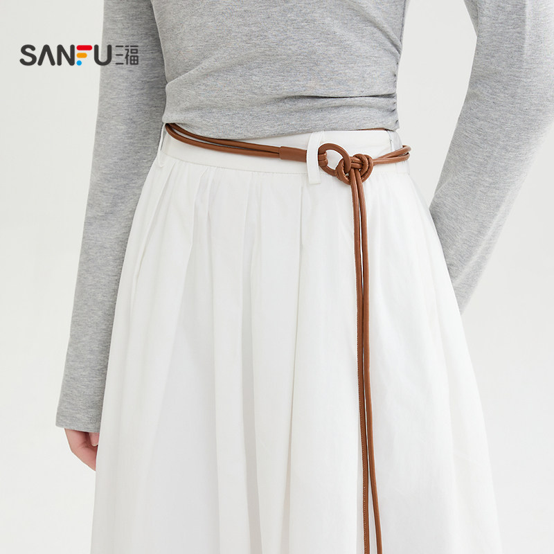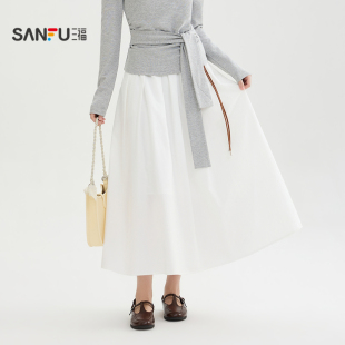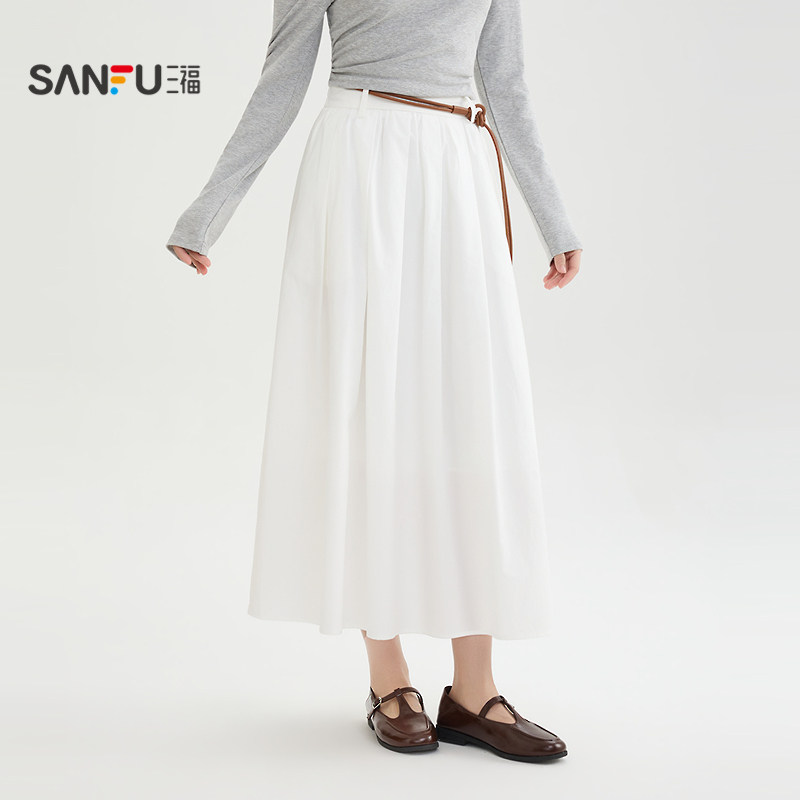 三福仙女裙长裙2026春季 518383 口袋皮腰带松紧腰散摆半身裙女装