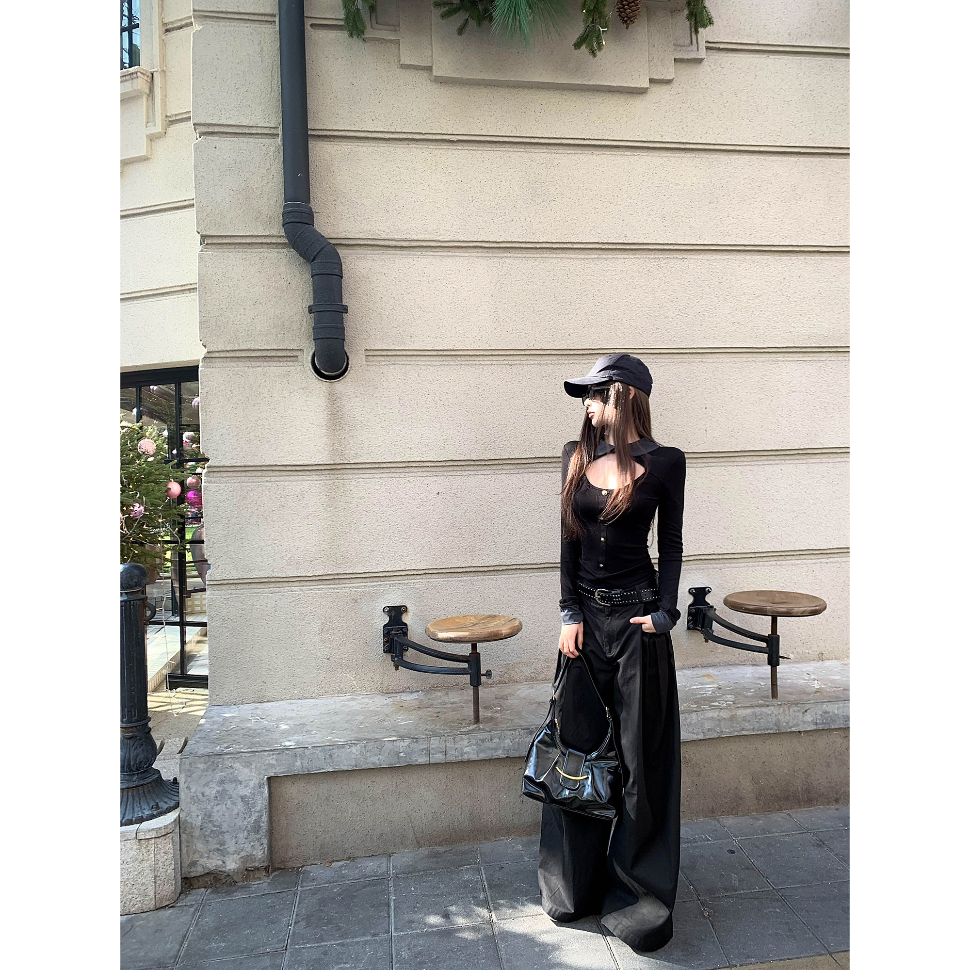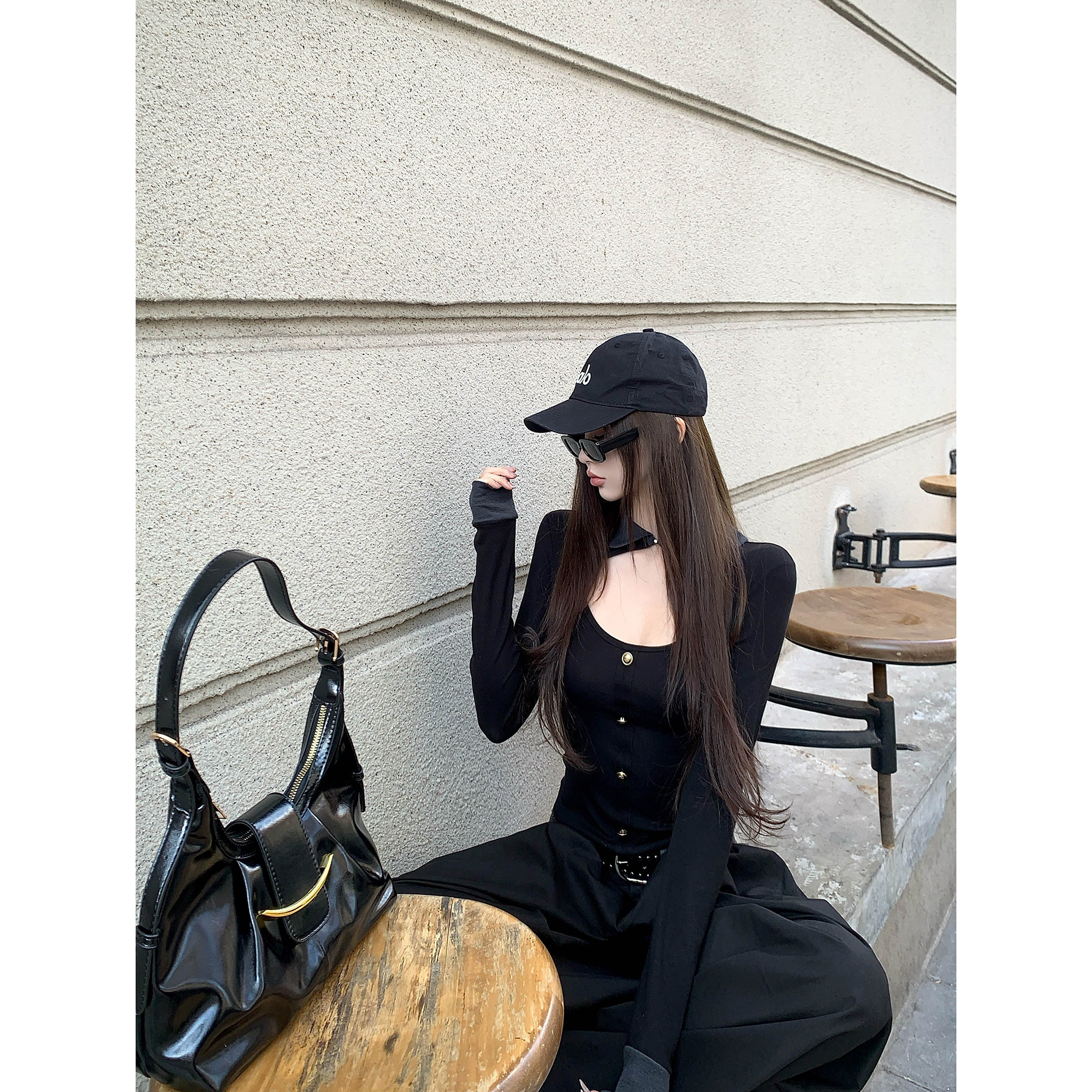 长袖 女修身 T恤打底上衣 扇形镂空拼接领黑色针织衫 Thas9i九亿