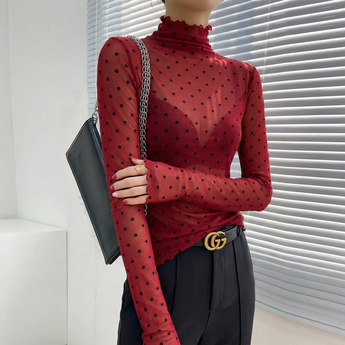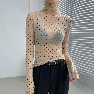 咖色高领波点蕾丝打底衫 内搭绝美叠穿透视网纱上衣高级感 2026新款
