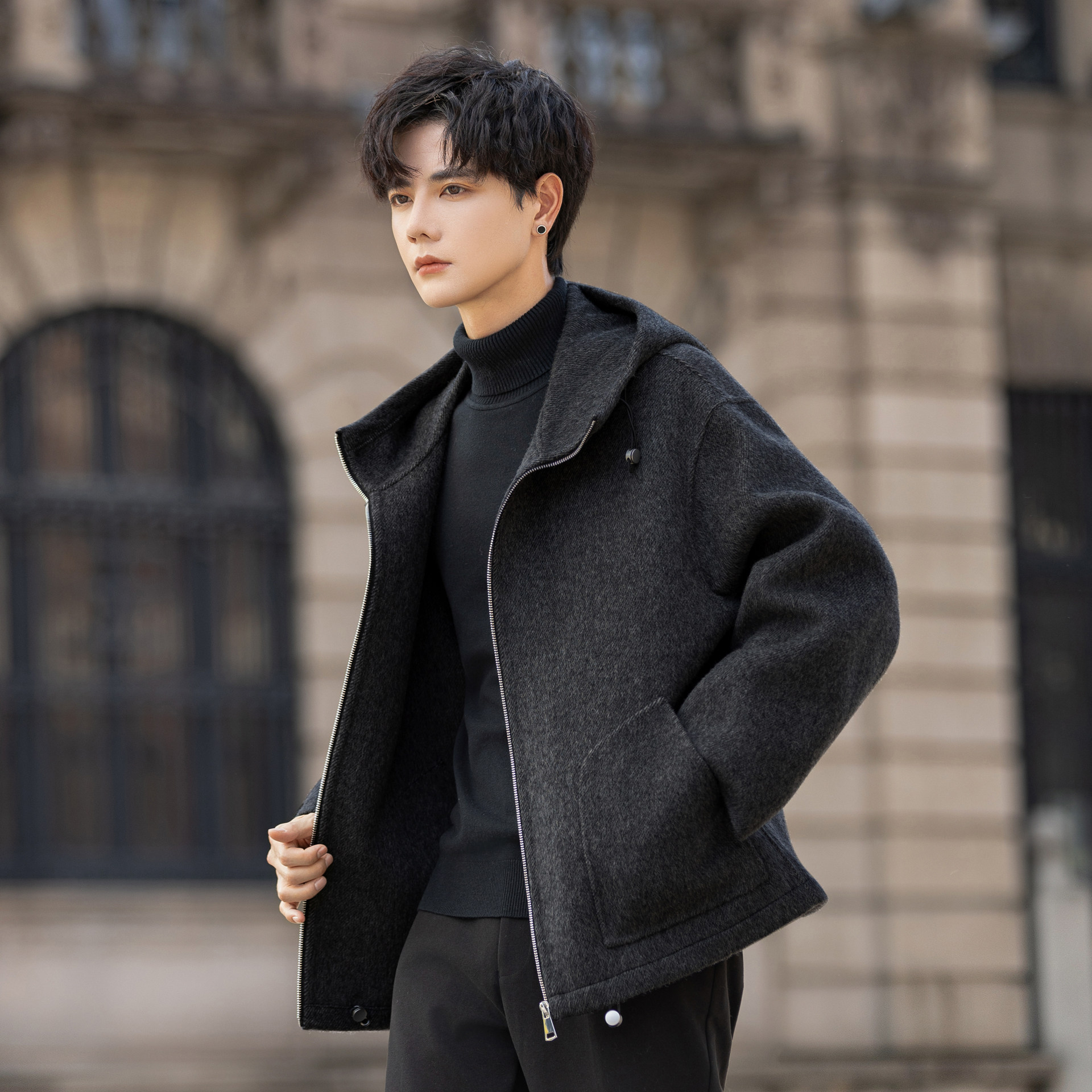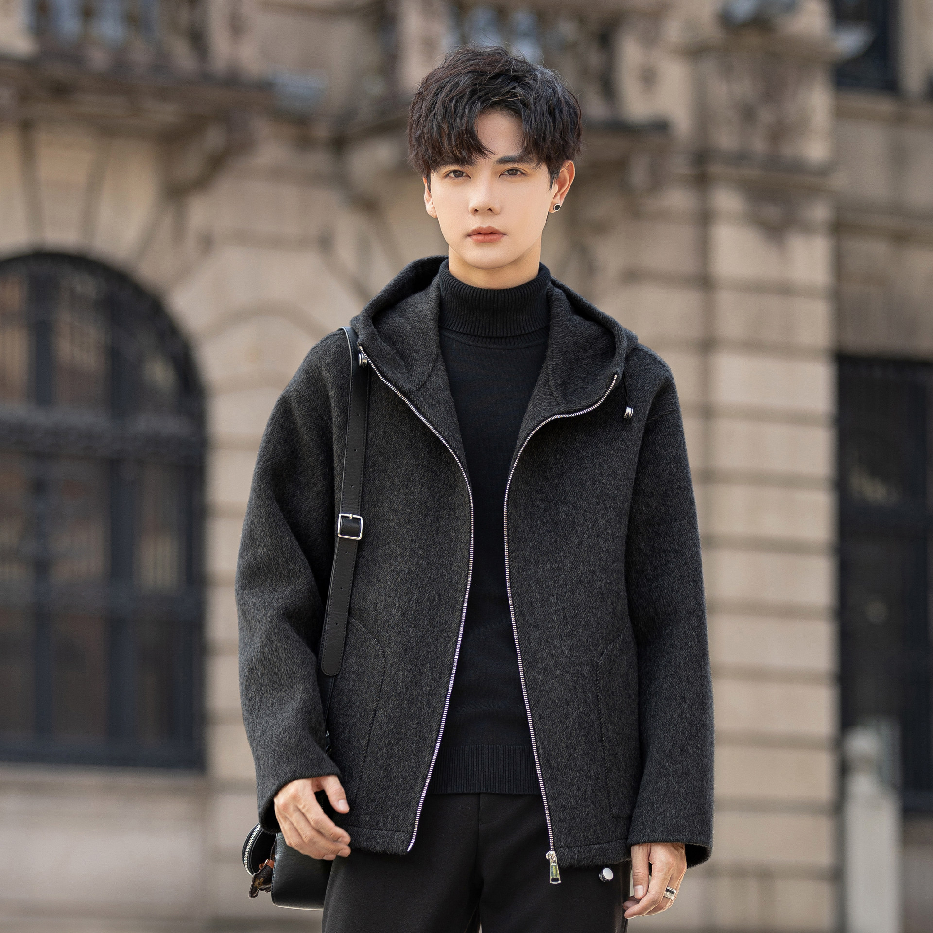 短款 新款 青少年 双面绒夹克2026秋冬季 连帽100纯羊毛呢子外套男士