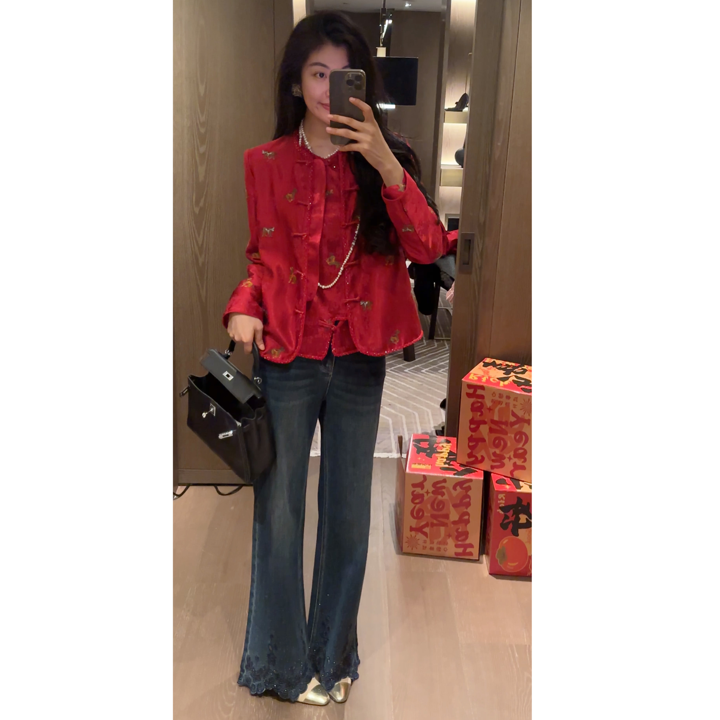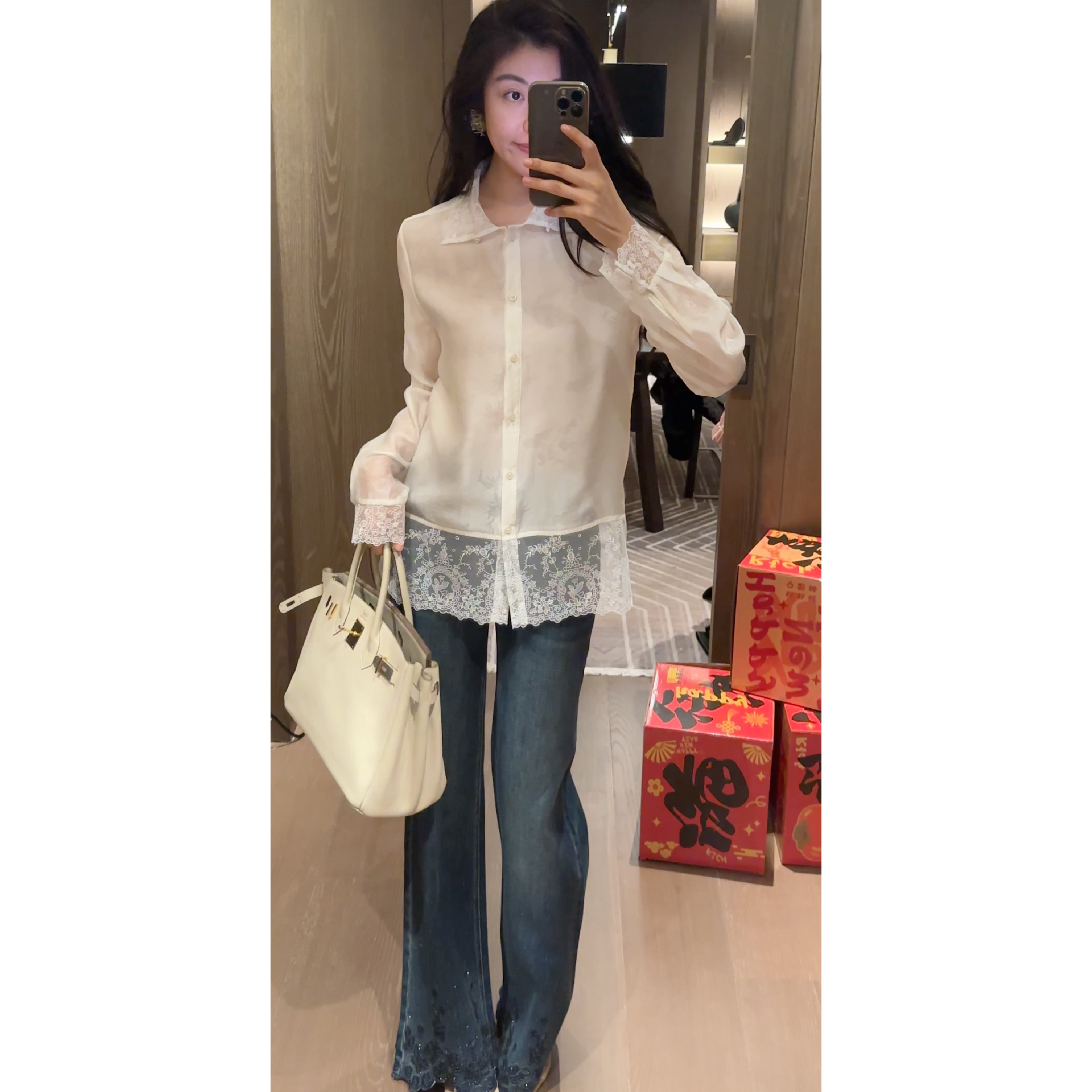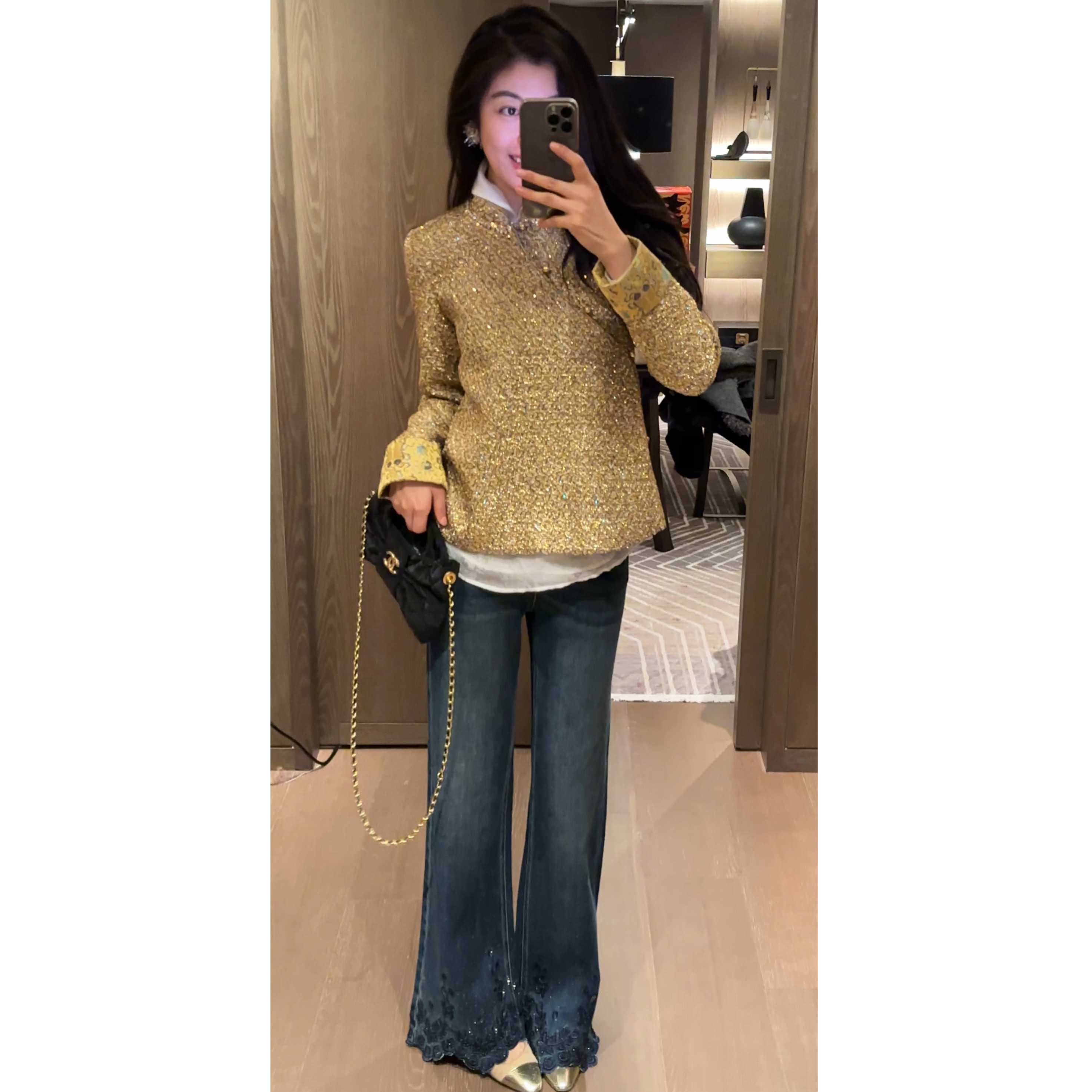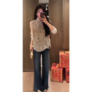 时髦设计感蕾丝刺绣烫钻高腰显瘦微喇牛仔裤 N.COU妮蔻26春新款