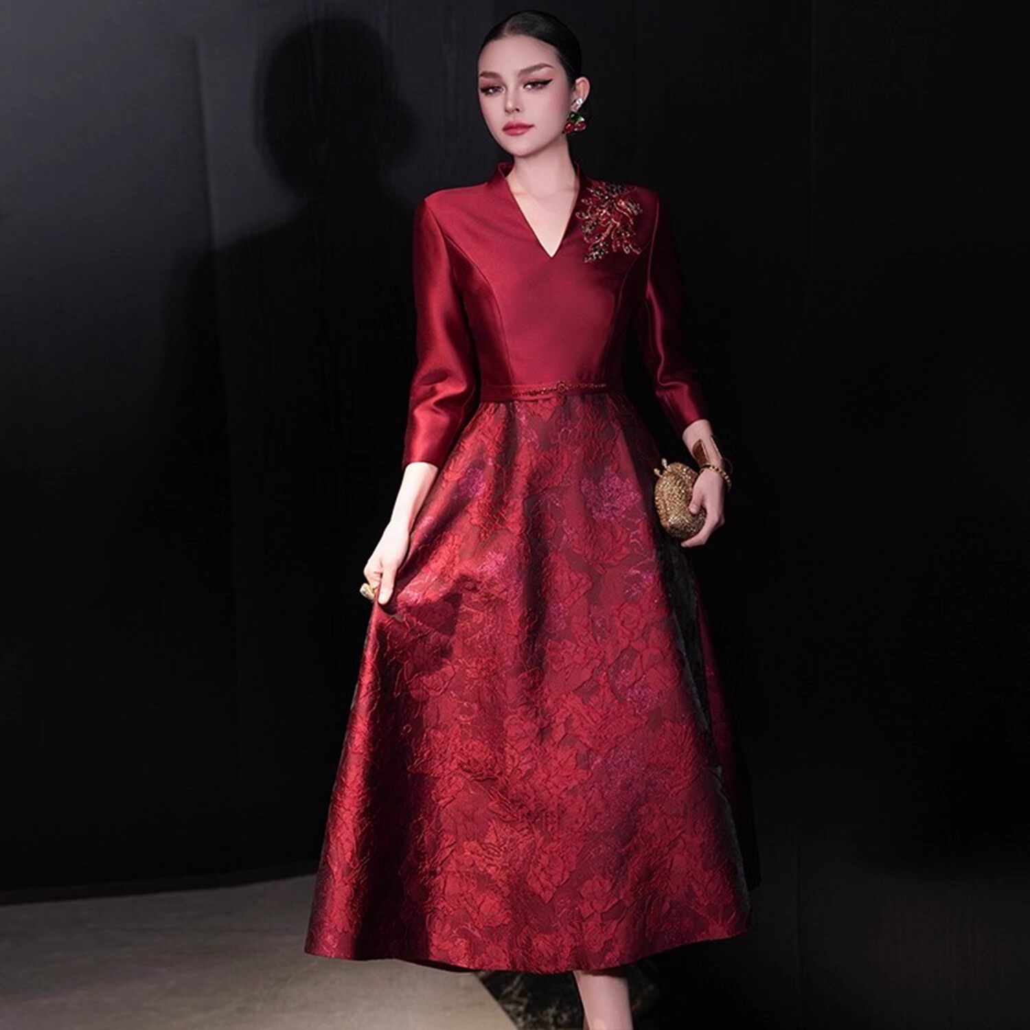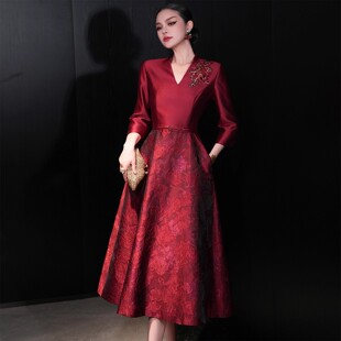 新中式 深V领礼服裙高端优雅气质宴会敬酒服女 红色长袖