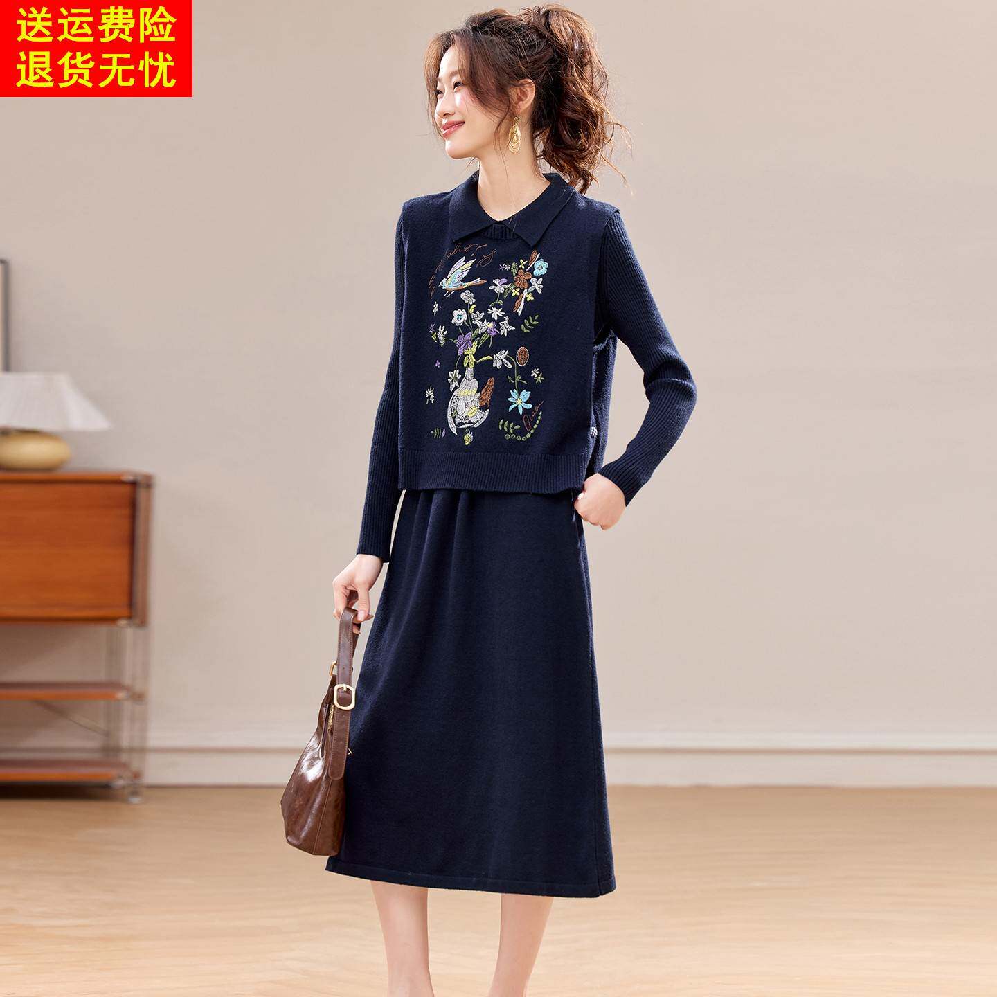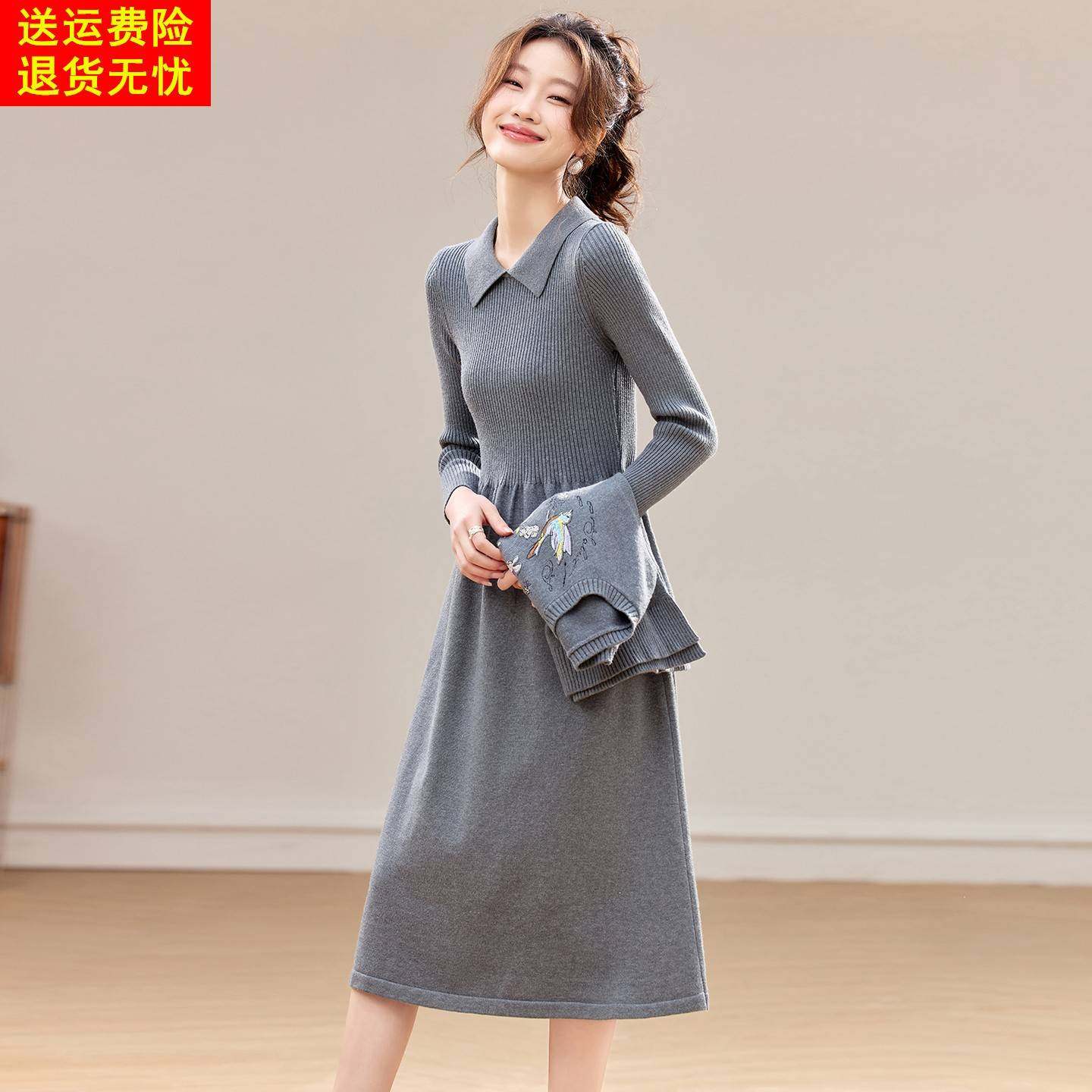 两件套裙子 刺绣翻领显瘦中长款 灰色针织连衣裙套装 女2025秋冬新款