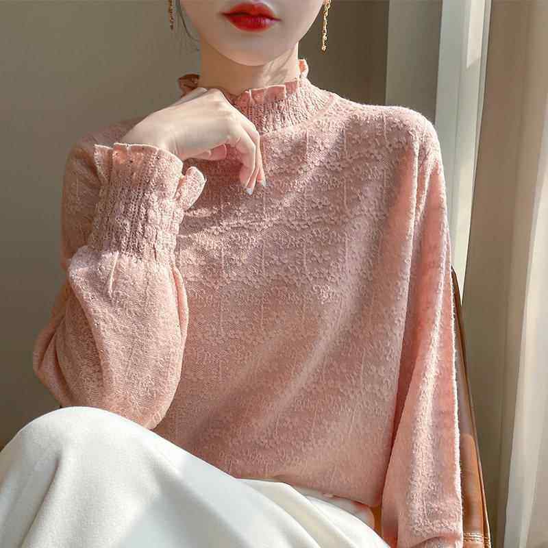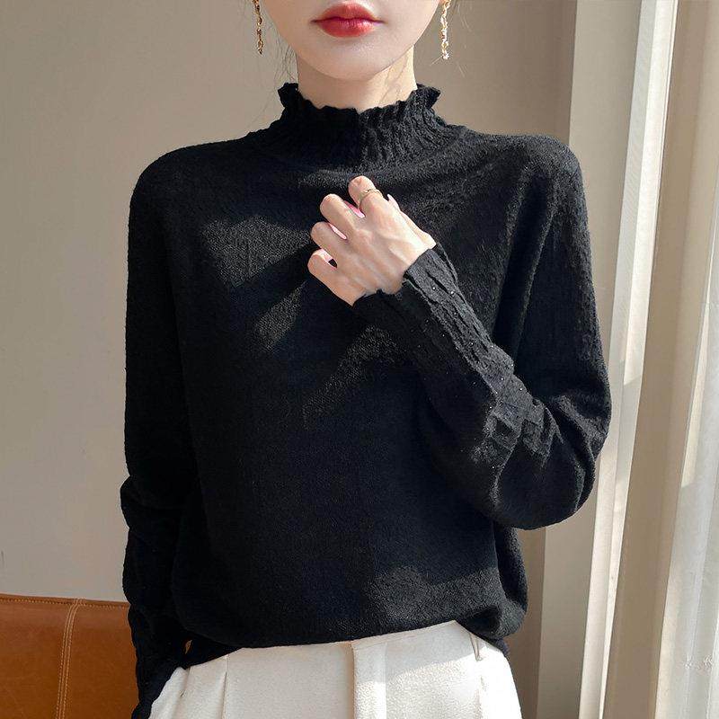 2025秋冬新款 女减龄气质高领显瘦1219e 优雅木耳蕾丝边针织打底衫