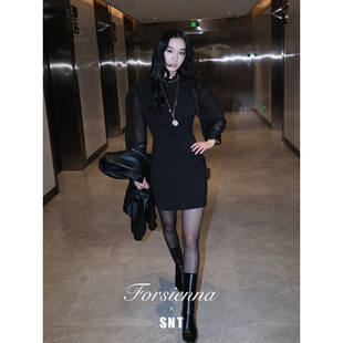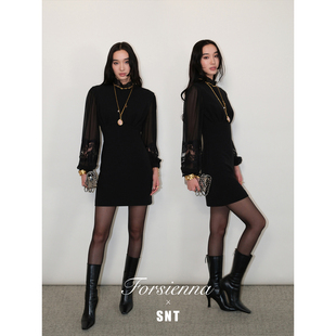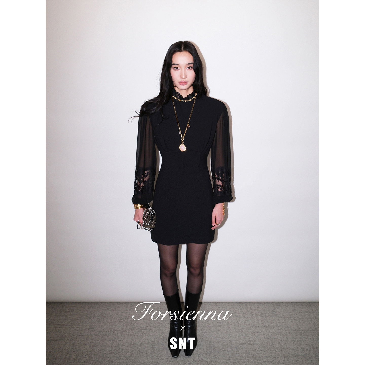 鱼骨腰封修身 真丝蕾丝拼接袖 连衣裙 羊毛天丝面料 SNT