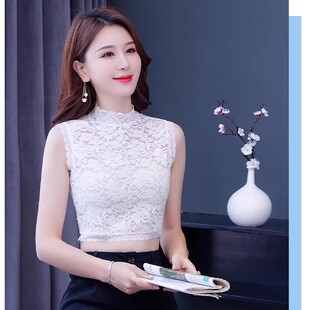t恤上衣潮 半高领无袖 蕾丝背心女百搭性感镂空内搭修身 显瘦打底衫