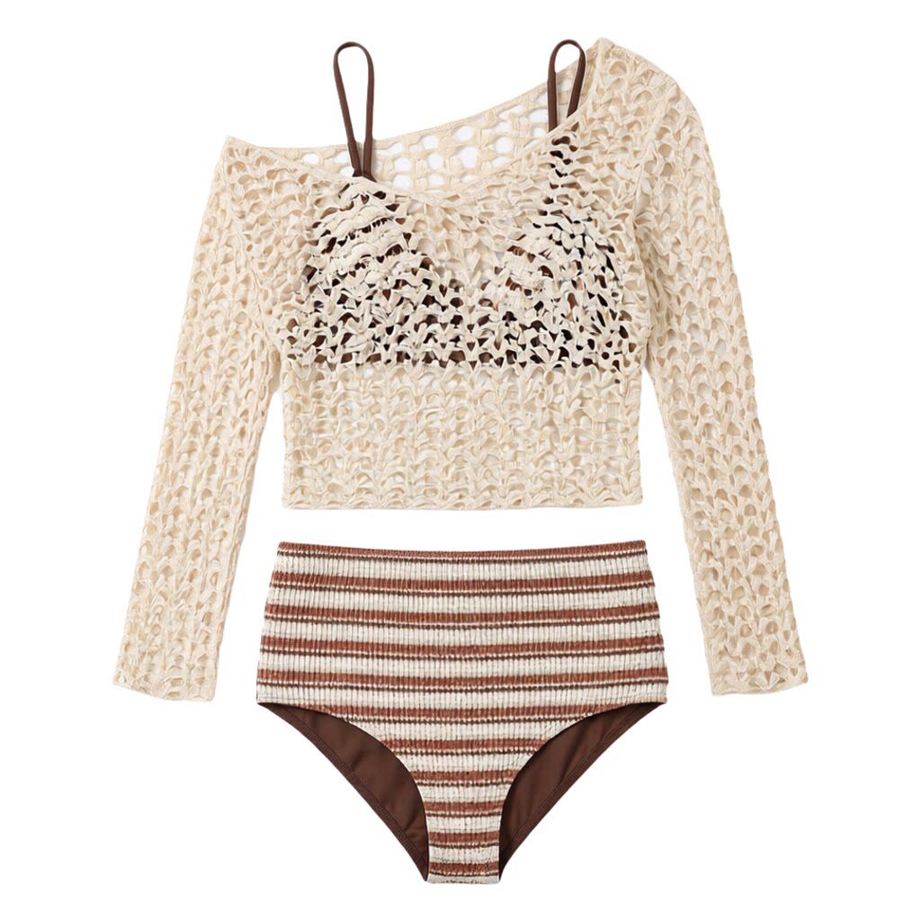 蜜Dream泳衣女慵懒条纹比基尼三件套针织镂空罩衫 分体露肩显瘦装