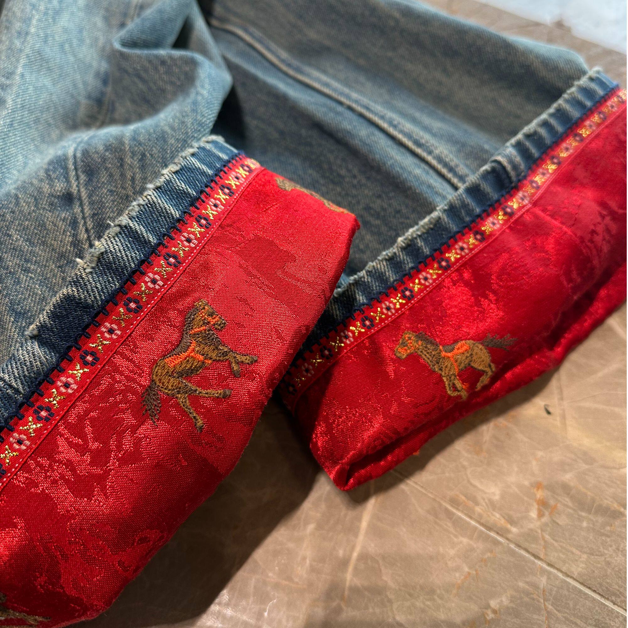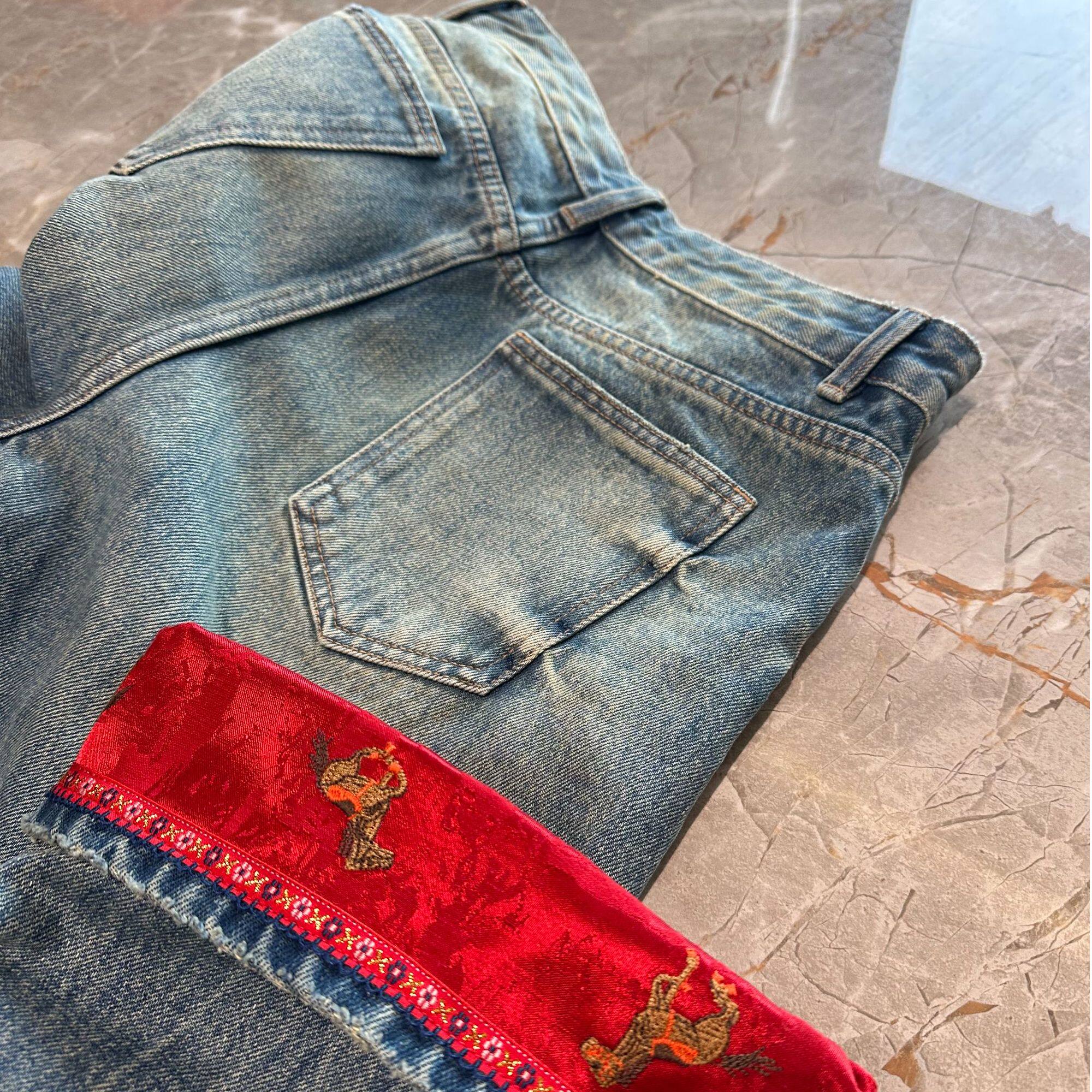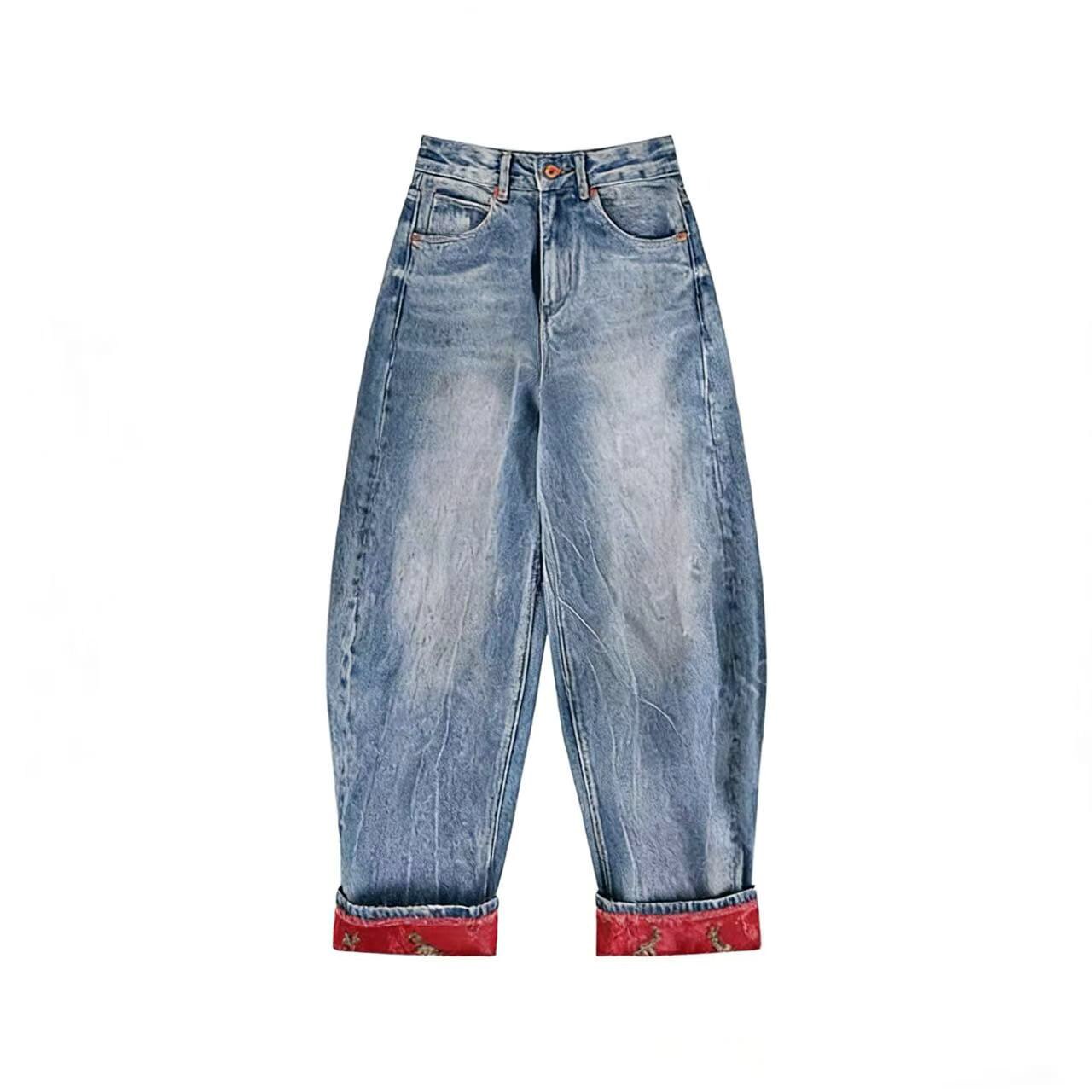 G.yantong高腰国风翻边刺绣无弹牛仔裤 休闲风KZ127 直筒裤
