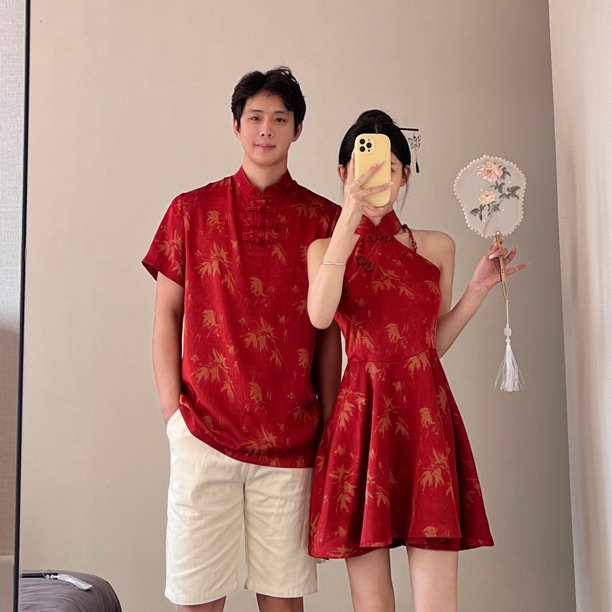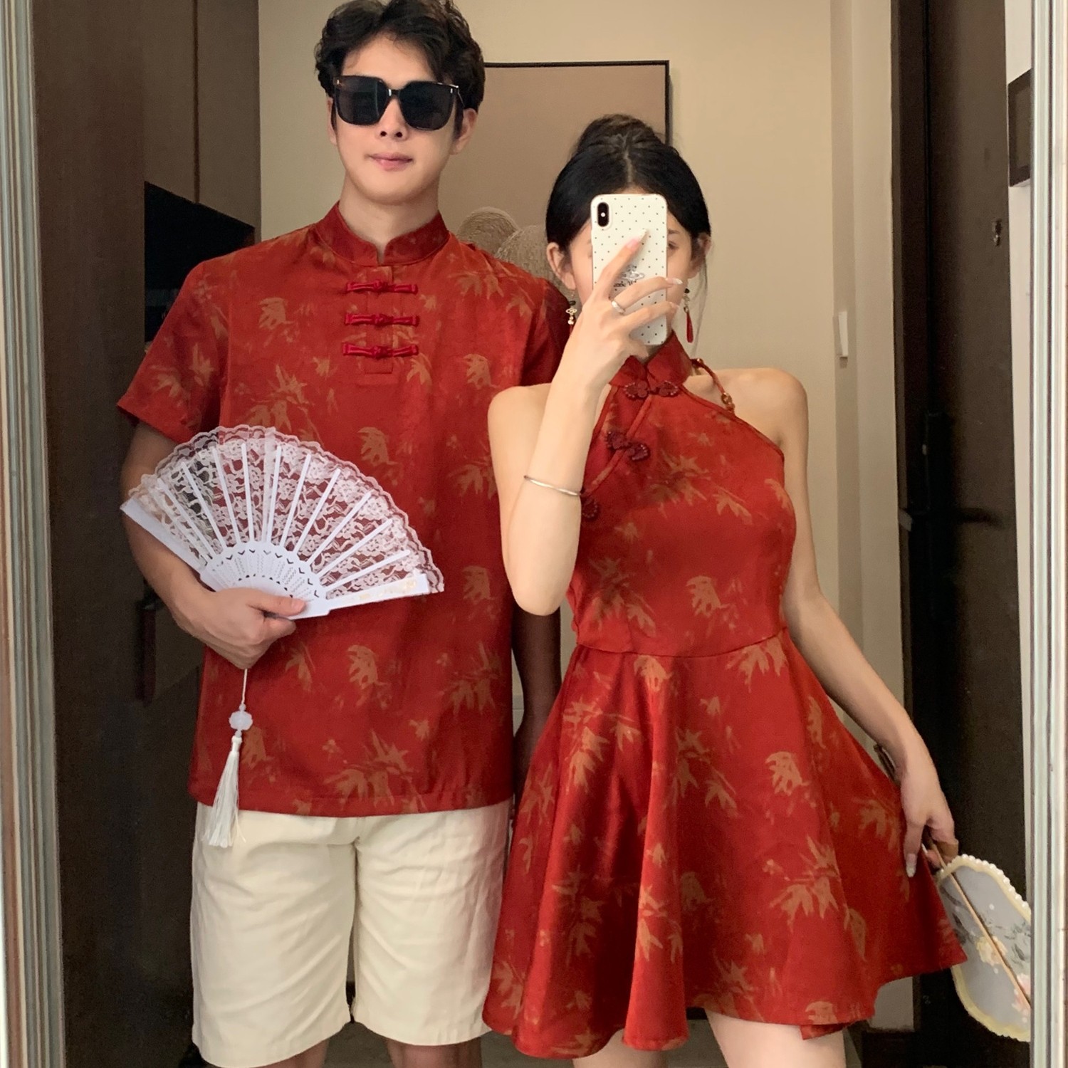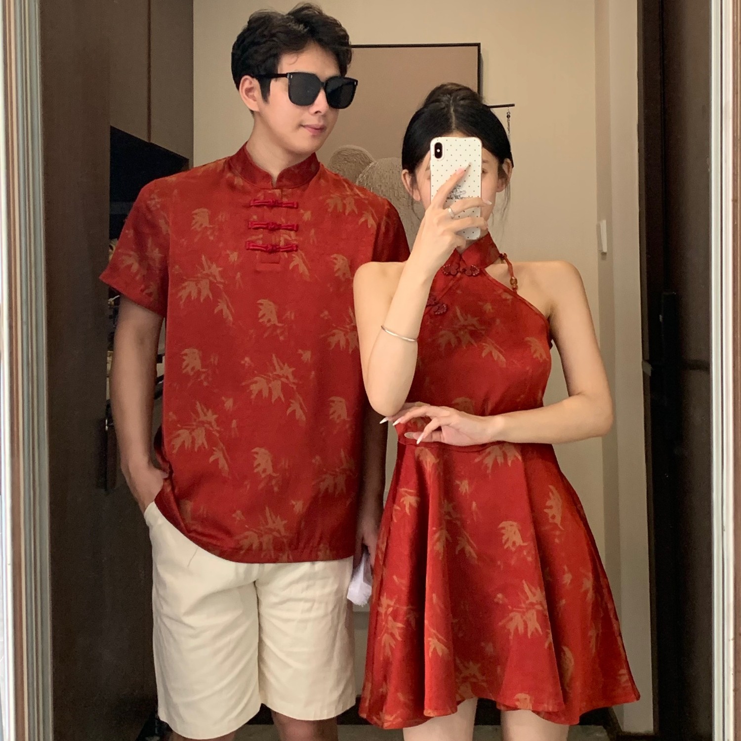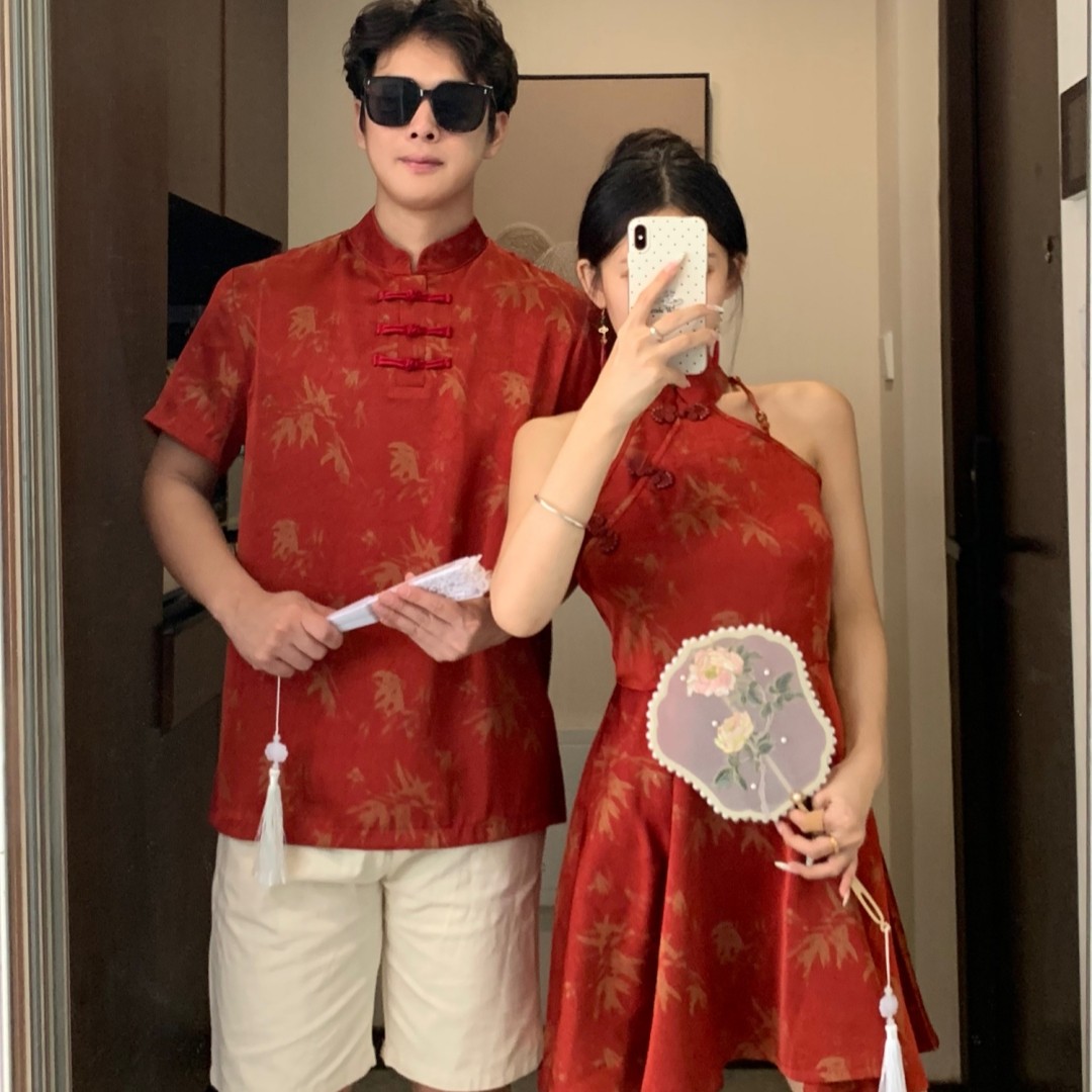 显瘦国风改良旗袍穿搭结婚订婚一裙一衣新年衣服 夏装 新中式 情侣装