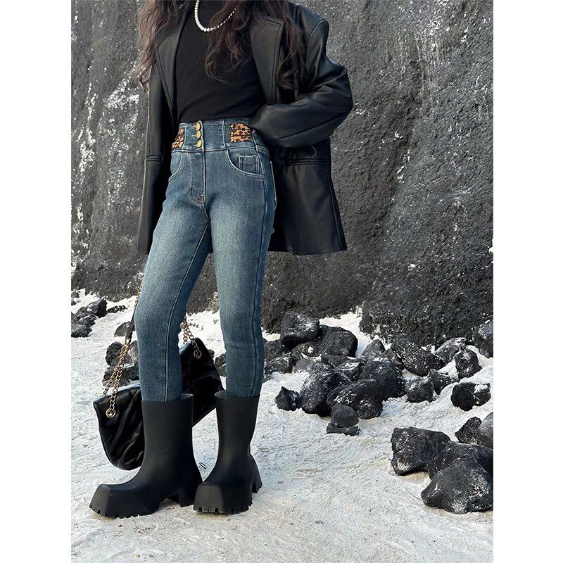 儿童长裤 小个子加厚洋气铅笔靴裤 一体绒24秋冬新款 女童小脚牛仔裤