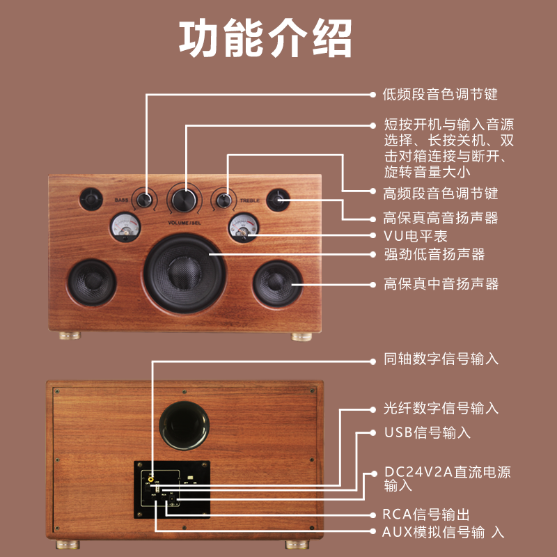 复古实木花梨木发烧级HIFI蓝牙音箱大功率重低音炮高音质木质