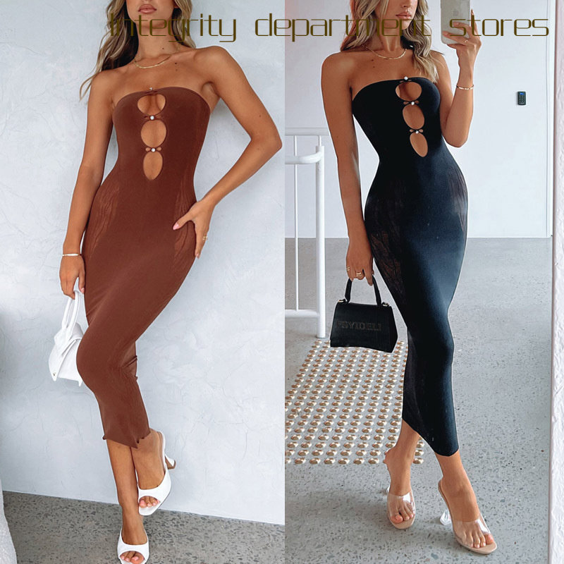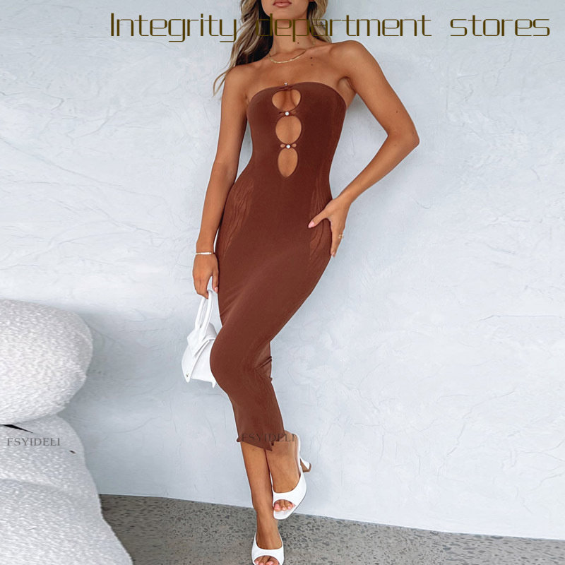 shemoda 抹胸连衣裙女拼接飘带挂脖长裙 欧美风性感一字领高腰修身