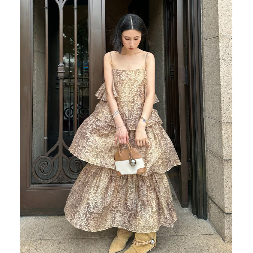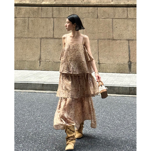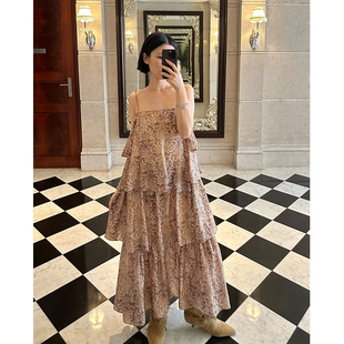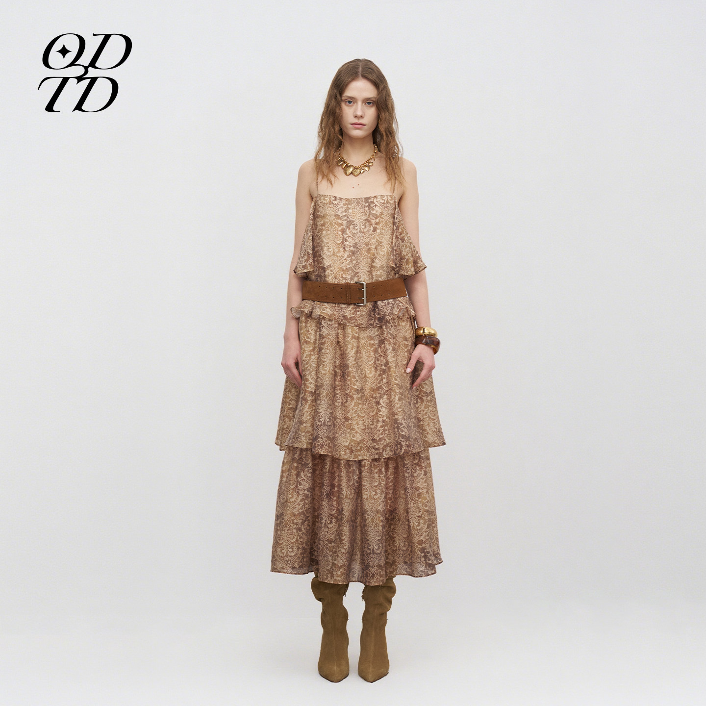 新款 ODTD25秋季 民族风印花吊带层叠连衣裙百搭长裙 设计师女装