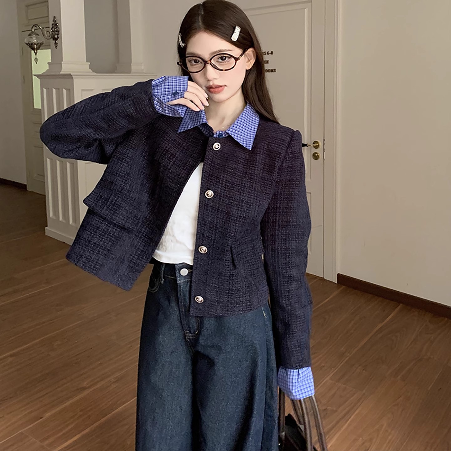 外套女秋宽松休闲上衣 复古藏青色小香风翻领短款 2025早秋时尚 法式