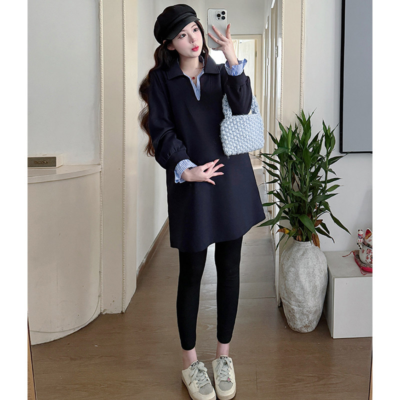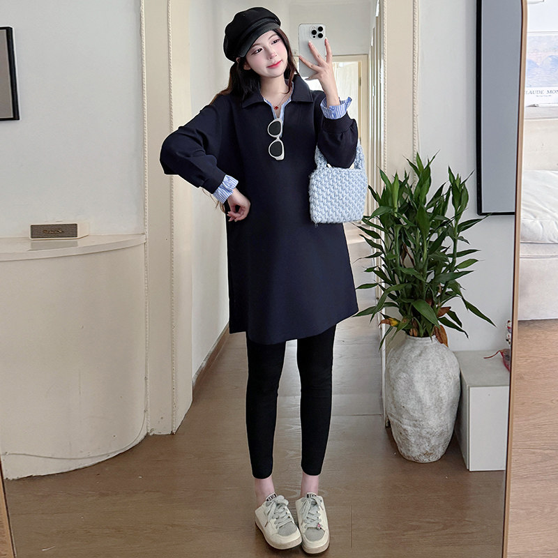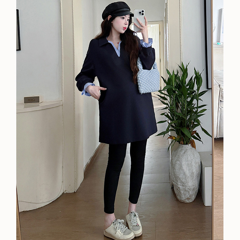 孕妈遮肚中长款 翻领韩版 卫衣两件套女 春秋2026新款 孕妇藏青色套装