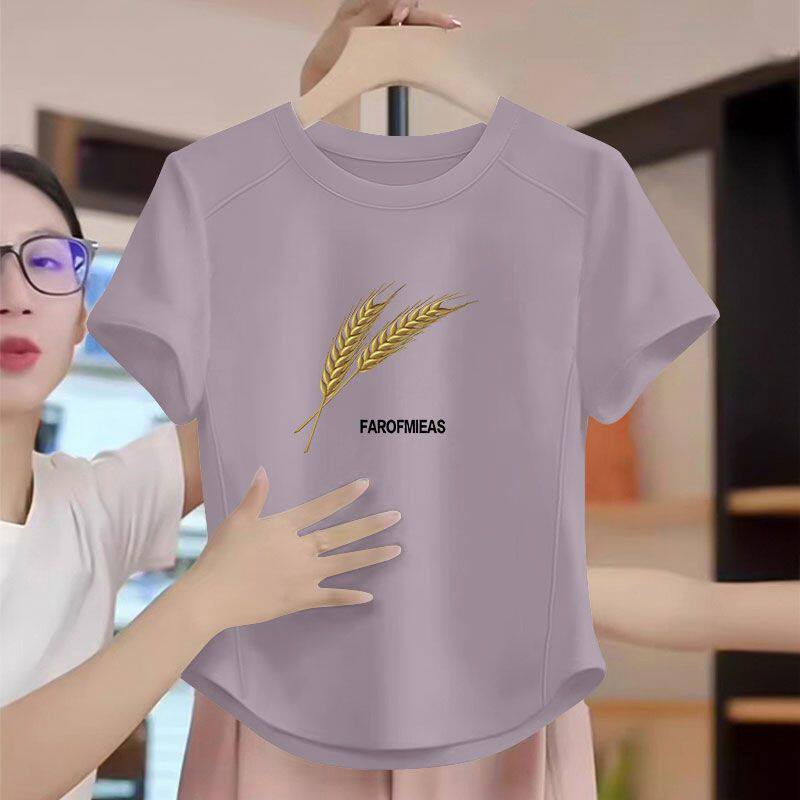 洋气通勤宽松遮肉显瘦ins上衣 韩版 100%纯棉短袖 鱼骨弧形T恤女夏季