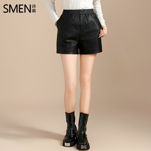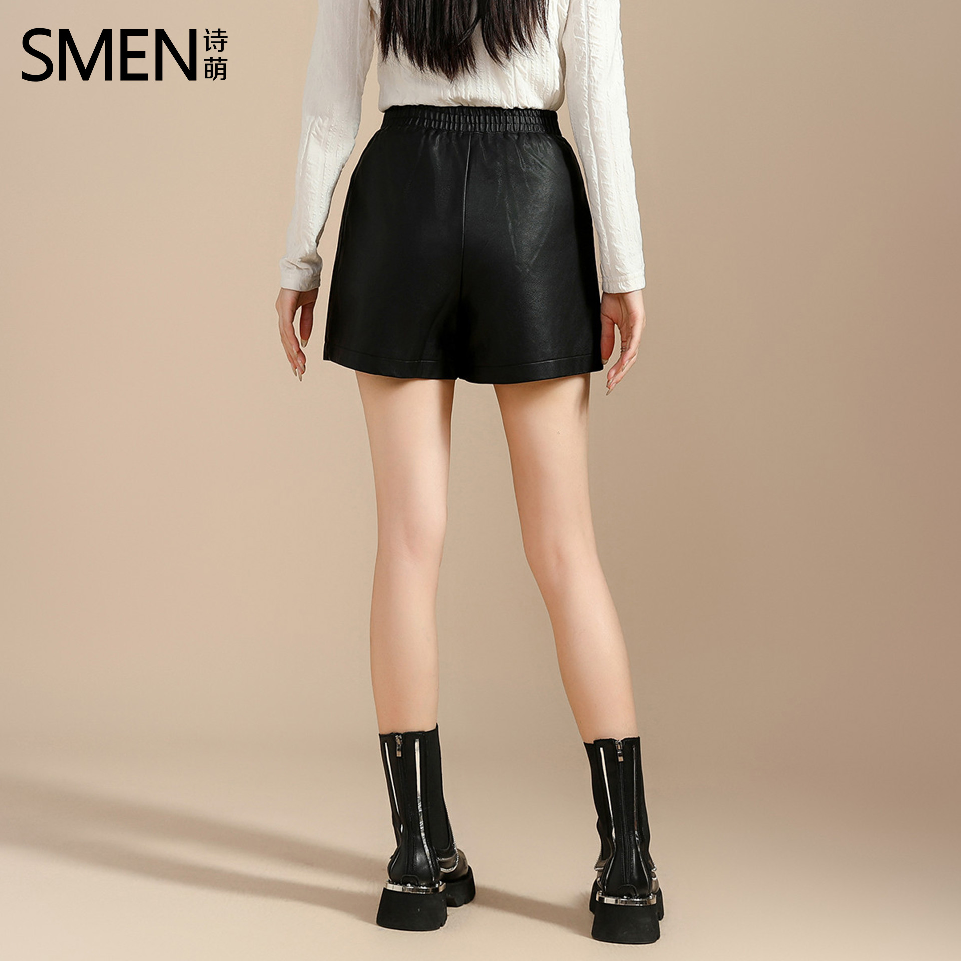 女士纯色简约休闲百搭仿皮裤 Smen 女秋季 复古PU皮裤 女 诗·萌美式