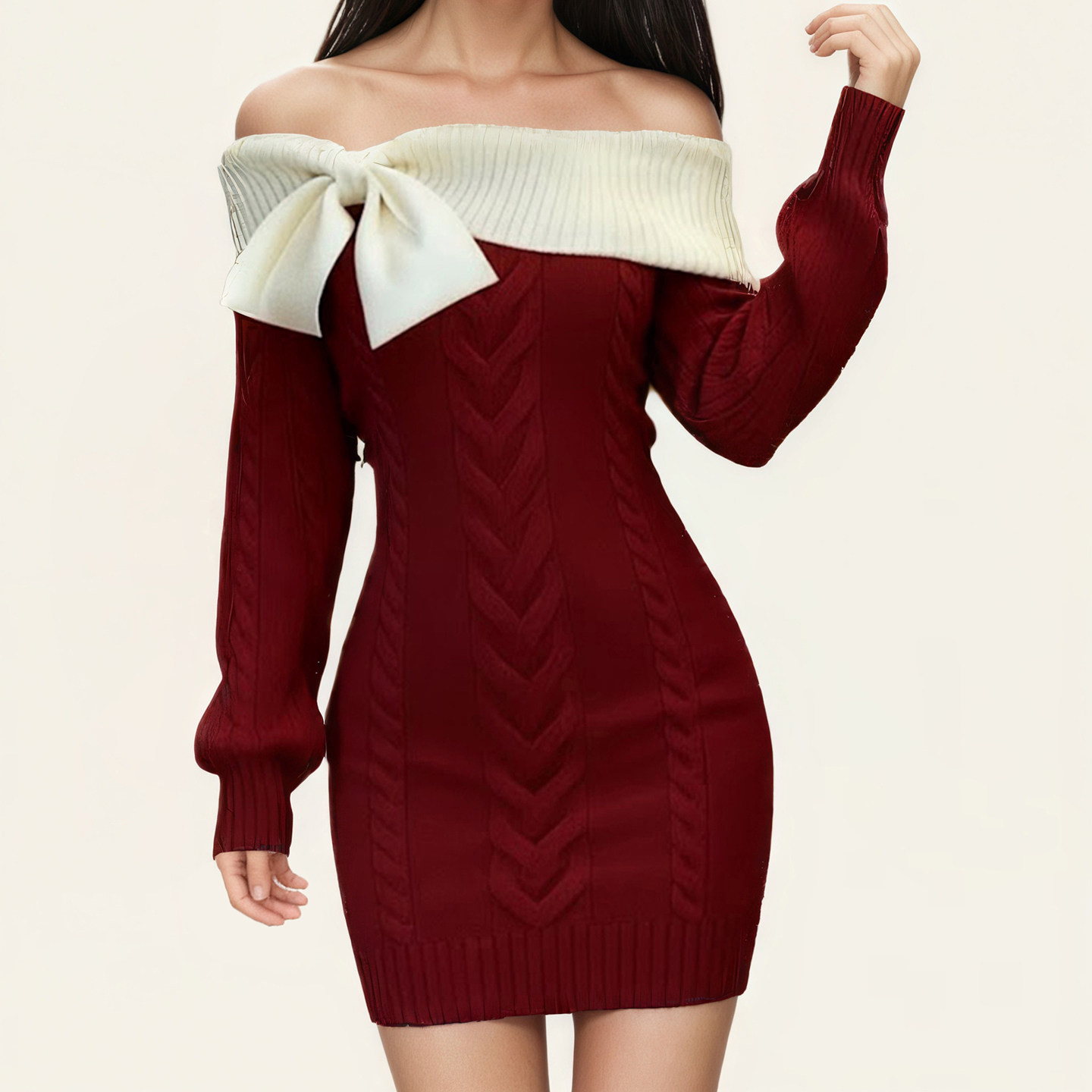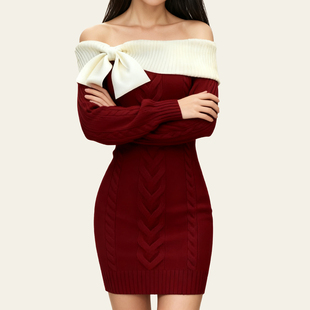 毛织连衣裙圣诞包臀短裙女 复古撞色一字肩蝴蝶结长袖 FUNOFF 美式