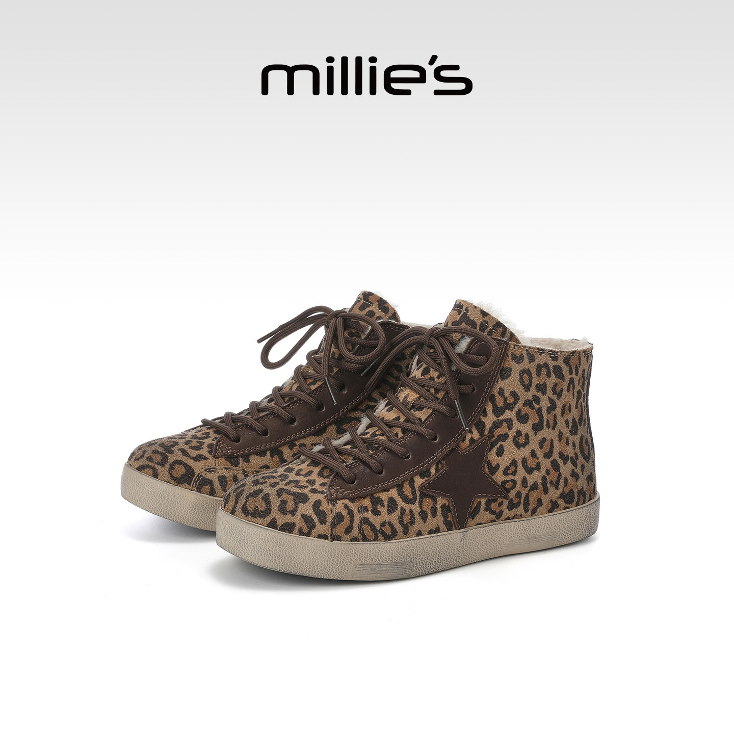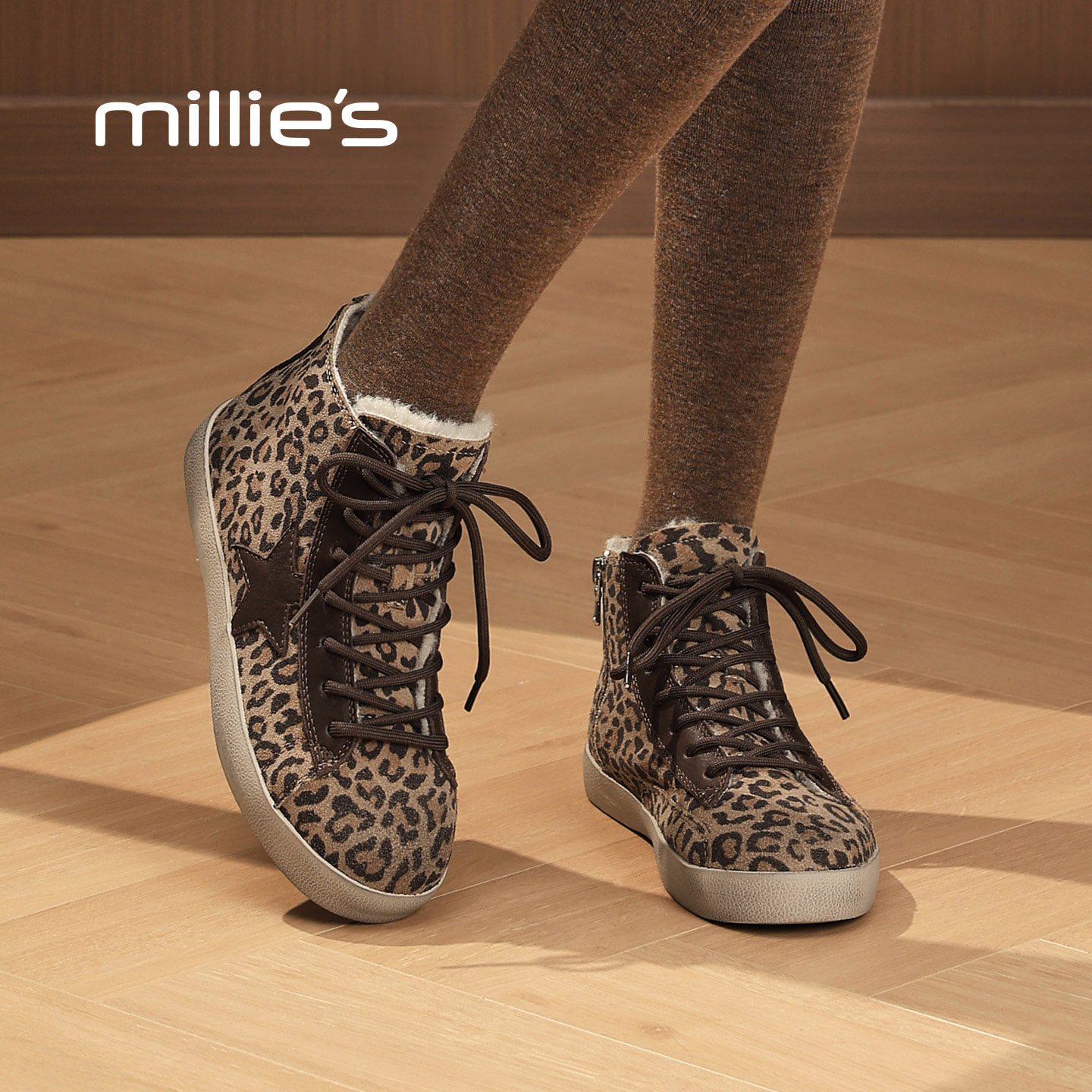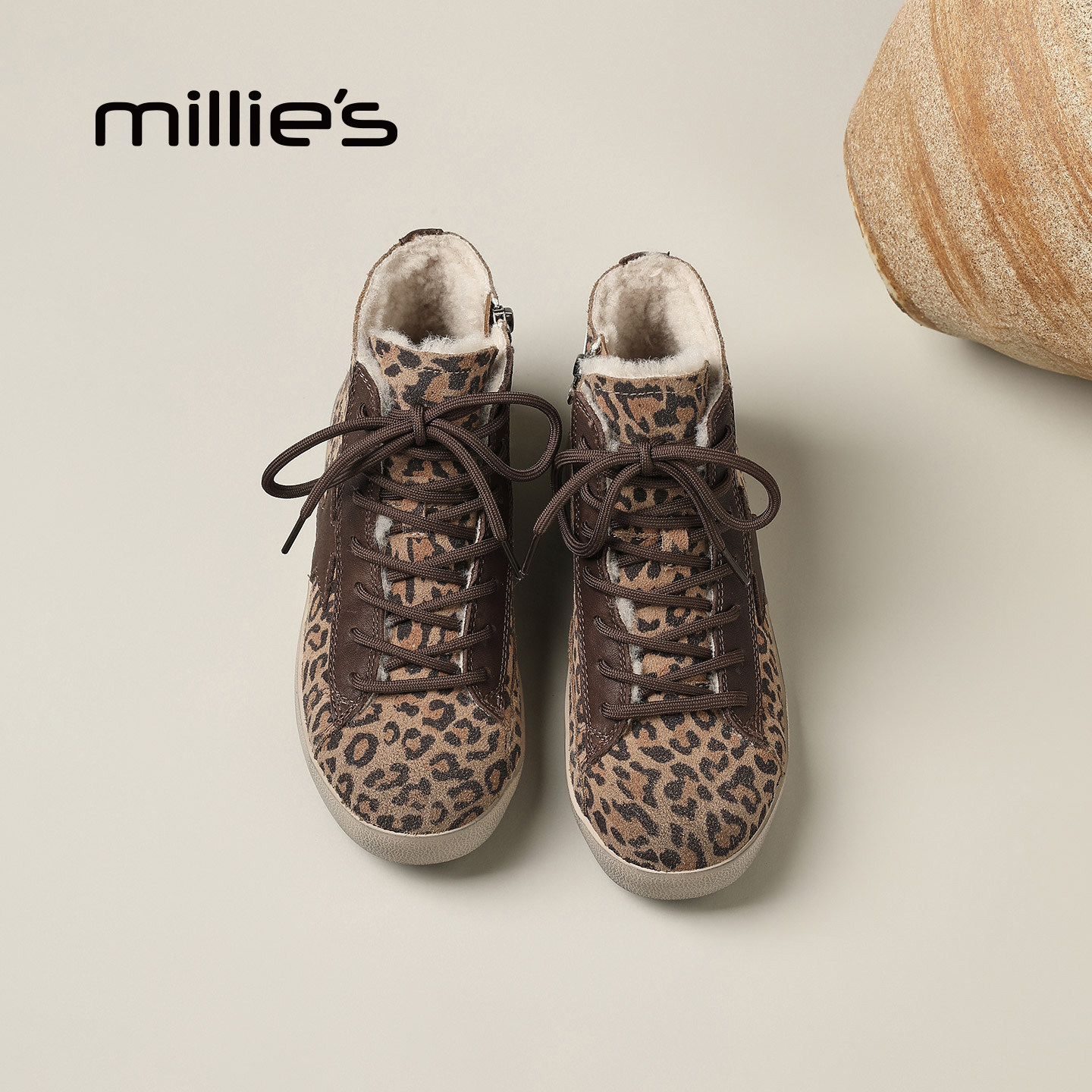 厚底女鞋 MILLIE 女系带加绒内增高轻便休闲鞋 妙丽豹纹高帮板鞋