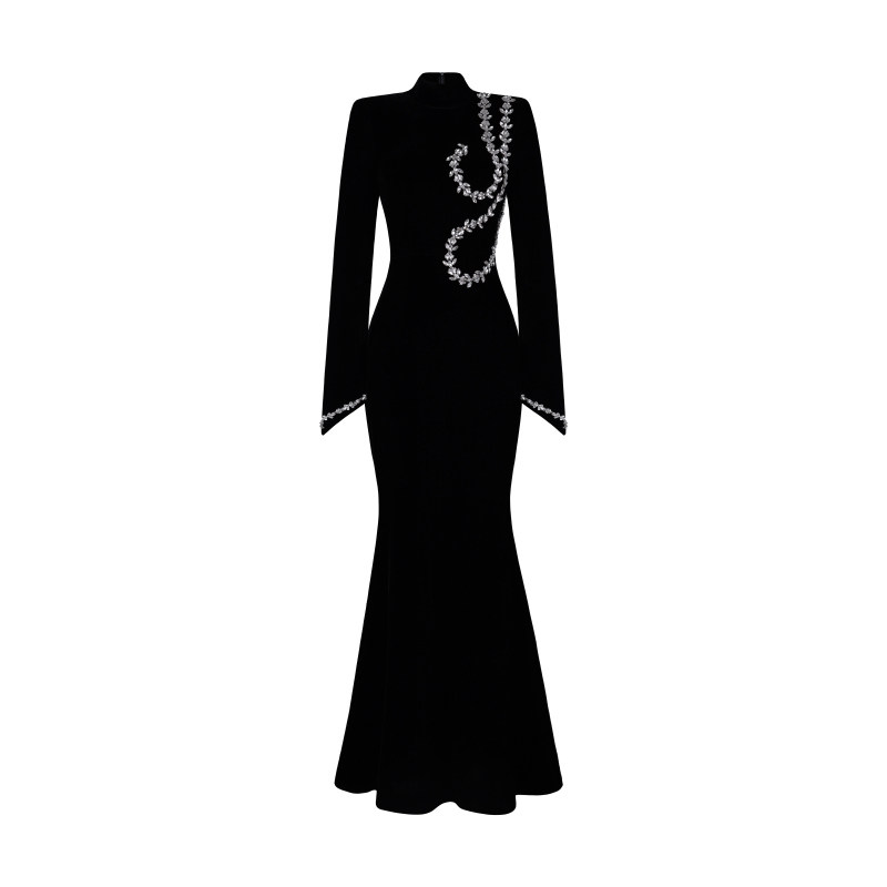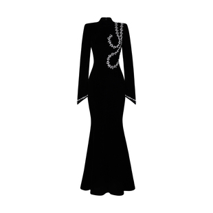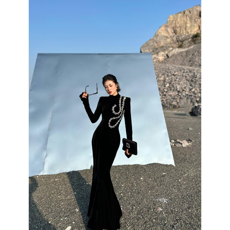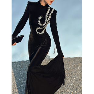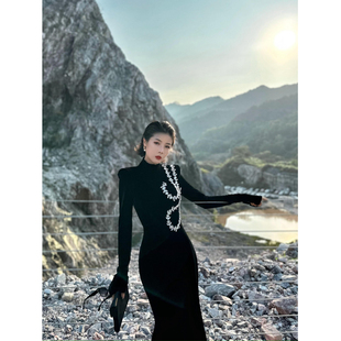 连衣裙 半高领长袖 XULU原创新款 进口丝绒钉珠鱼尾裙黑色百搭修身