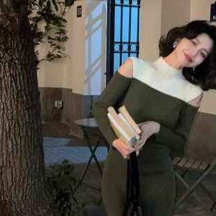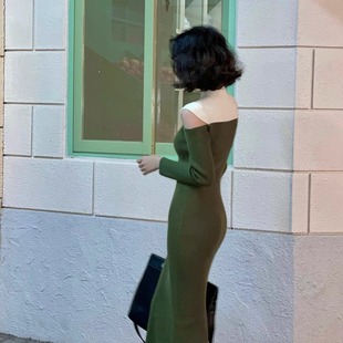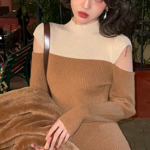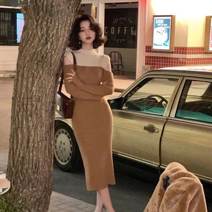 显瘦针织长裙子 连衣裙修身 Suny雅乔 秋冬粉色少女感烫钻露肩长袖