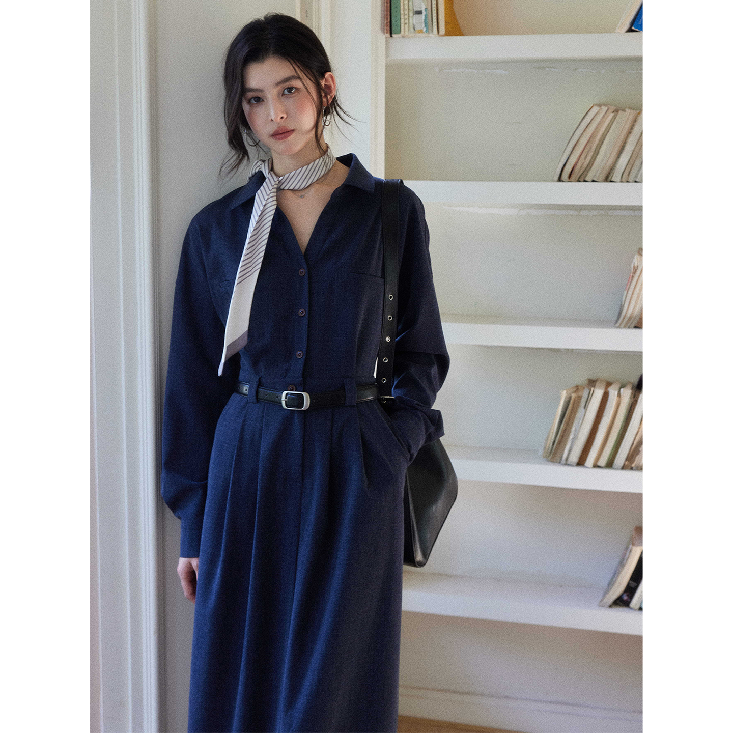 连衣裙女翻领大摆衬衫 知性通勤复古蓝色长袖 长裙 梦莱 贰羊设计