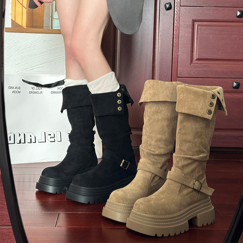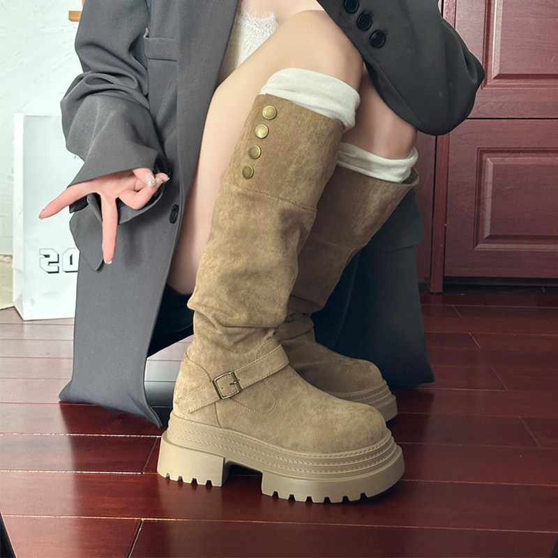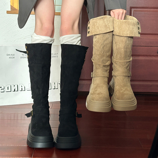 靴皮靴 时装 吴宣仪天美意千金靴复古厚底骑士靴加绒长靴女鞋 子新款
