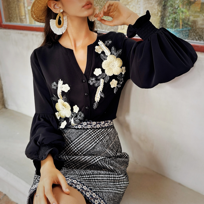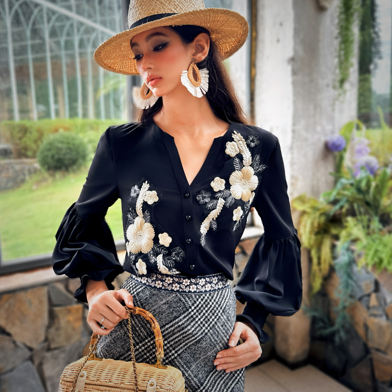 新款 粉红大布娃娃灯笼袖 2025秋季 上衣女长袖 设计感小众黑色衬衫