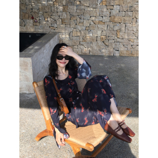 印花气质收腰长裙 圆领荷叶边连衣裙女长袖 pusumede 现货5.5折