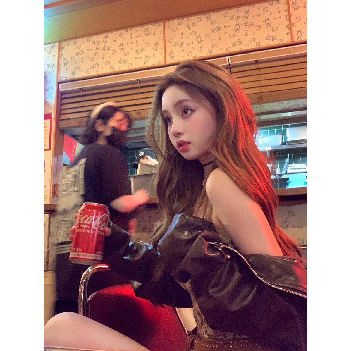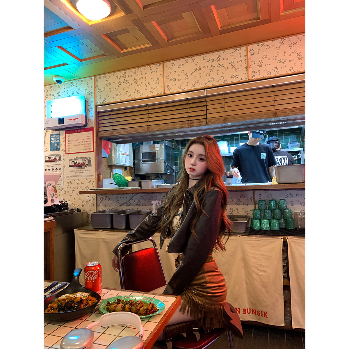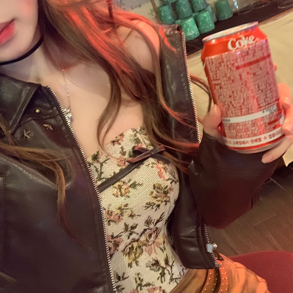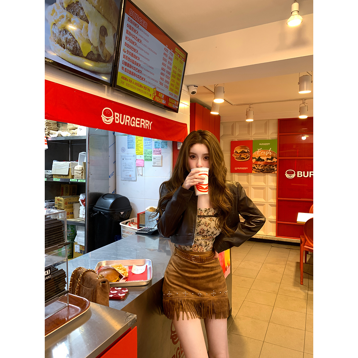 抹提花胸背心流苏半裙潇洒短款 你 小拽妹 美式 皮衣外套 懒懒llan