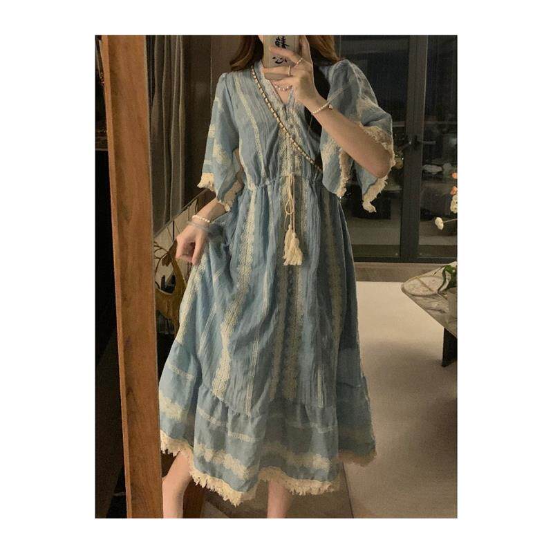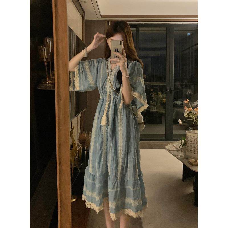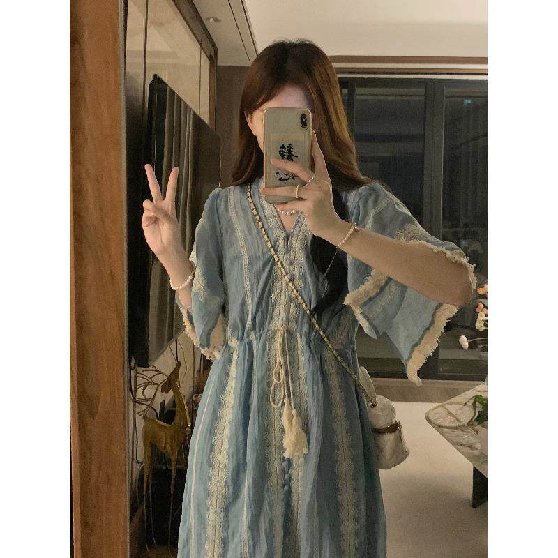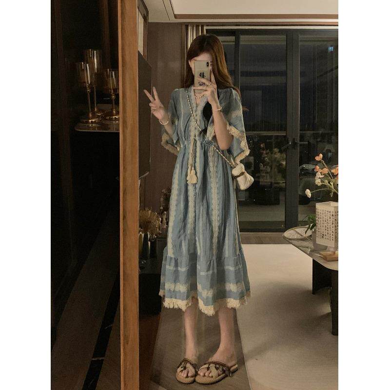 法式 民族风波西米亚连衣裙女高级感刺绣v领海边度假长裙沙滩裙子
