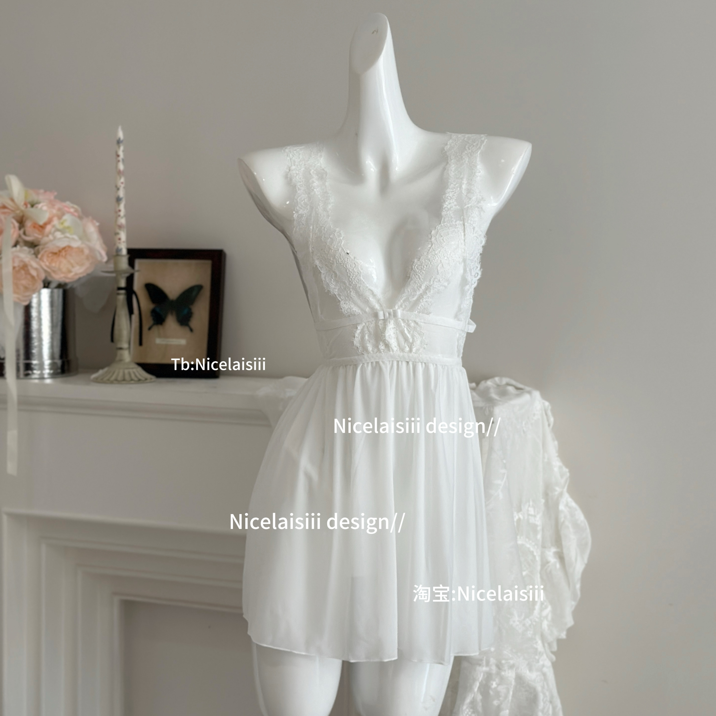 Nicelaisiii可颂 性感深v网纱吊带睡裙露背透明蕾丝御姐睡衣新款