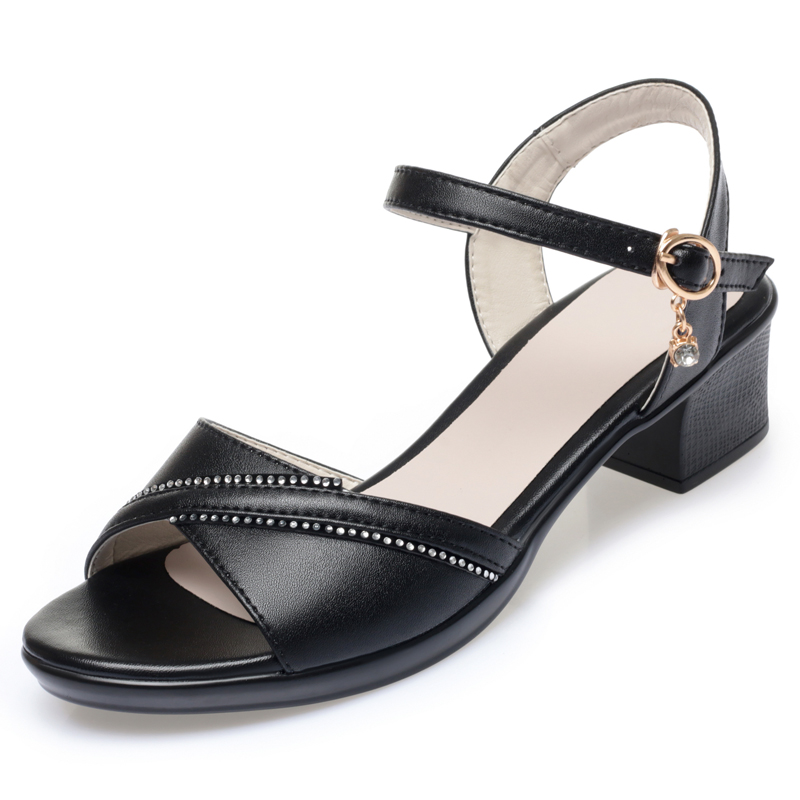 软底防滑舒适露趾女鞋 2025年夏季 女中跟粗跟妈妈凉鞋 真皮凉鞋 新款