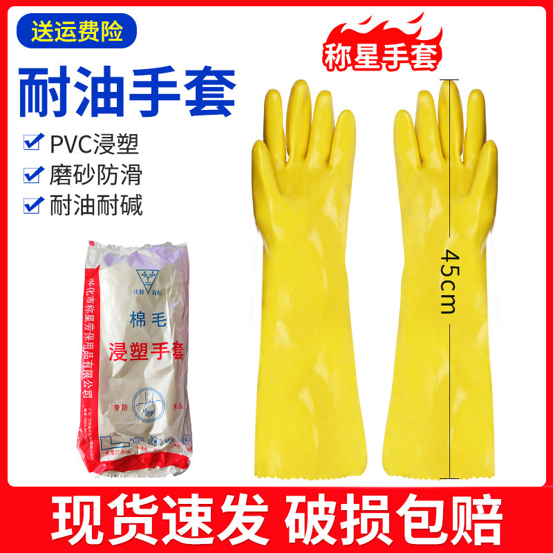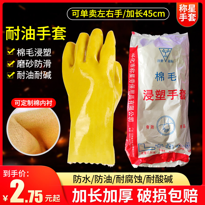 称星全浸塑手套加厚棉毛耐磨橡胶防滑防油腐耐酸碱劳保全胶皮手套