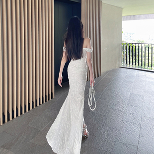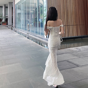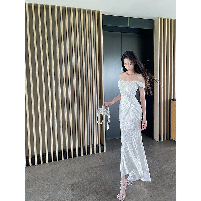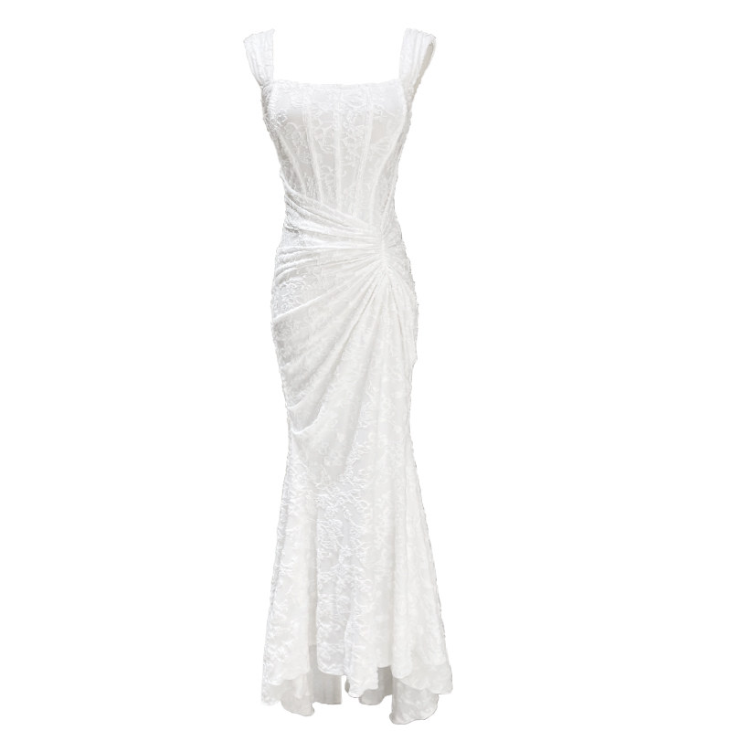 收腰鱼骨抽褶拖尾婚纱式 浪漫 包臀鱼尾连衣裙 法式 熊熊屋