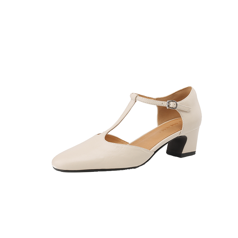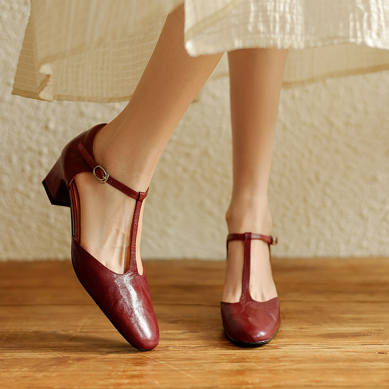 粗跟配裙子淑女鞋 T字带真皮侧空包头高跟鞋 夏 复古玛丽珍凉鞋 法式