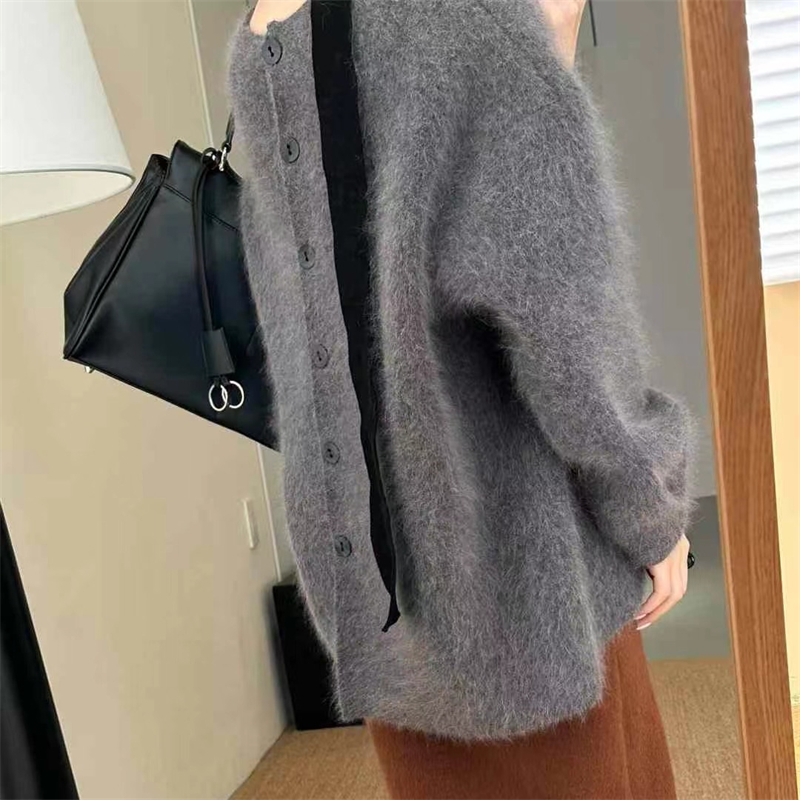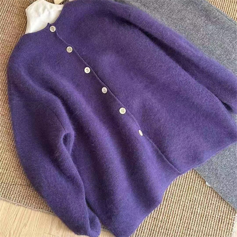 韩系设计感后背扣子浣熊长毛圆领毛衣女冬高端时尚 宽松显瘦针织衫