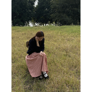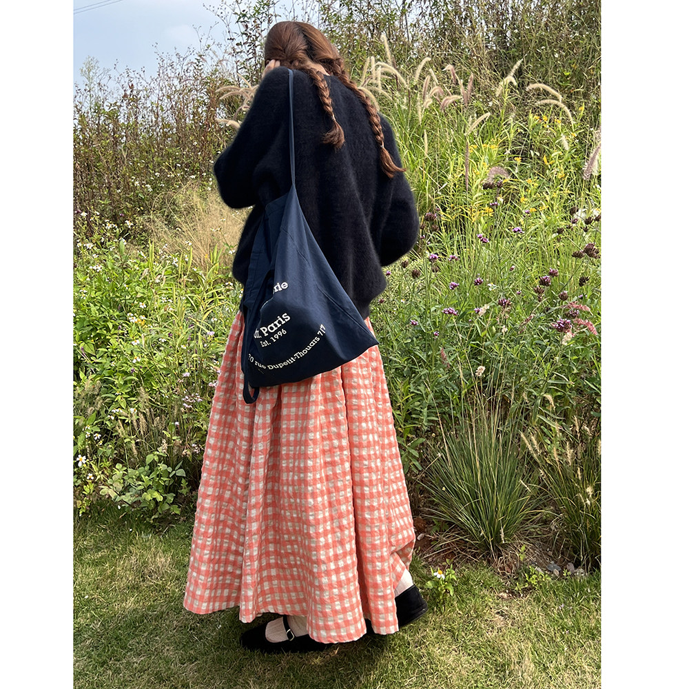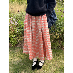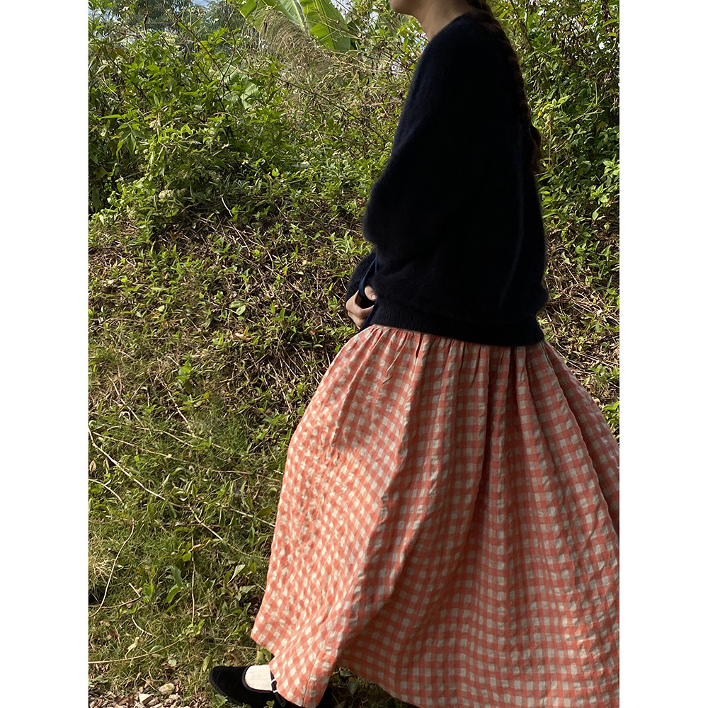 雏菊BellisPerennis2024AW 独特泡泡羊毛亚麻橘粉格两节半身伞裙