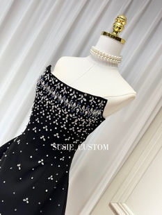 轻奢重工一字领鱼骨抹胸满钻水钻装 饰收腰A字花苞裙摆抹胸礼服裙