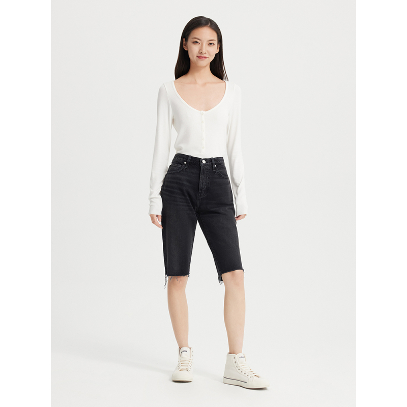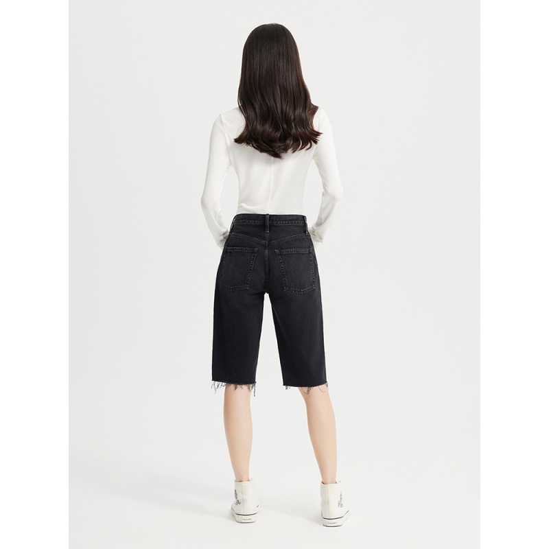 FRAME女士黑色高腰五分骑行裤 毛边复古 牛仔裤