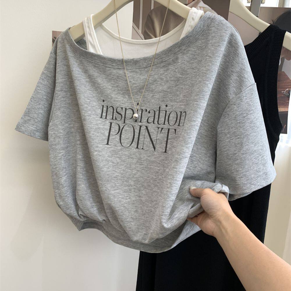 t恤女上衣潮 字母印花假两件露肩拼接吊带短袖 微胖mm夏季 百搭新款