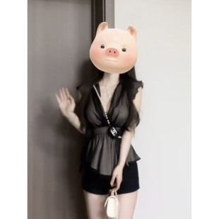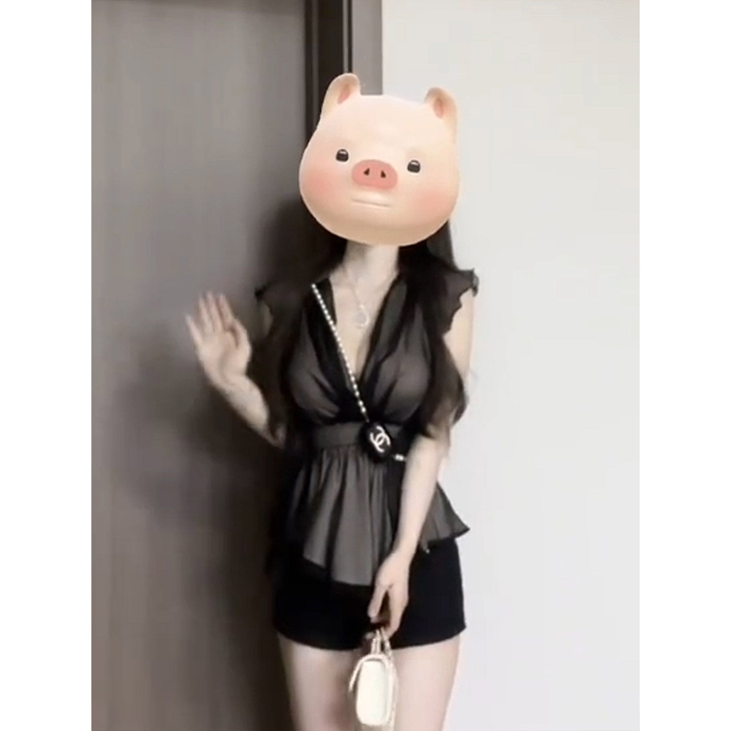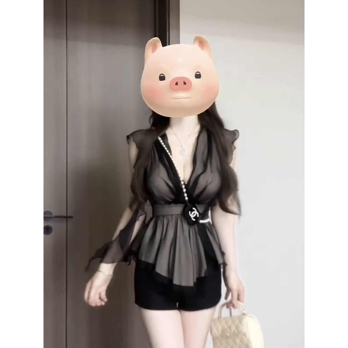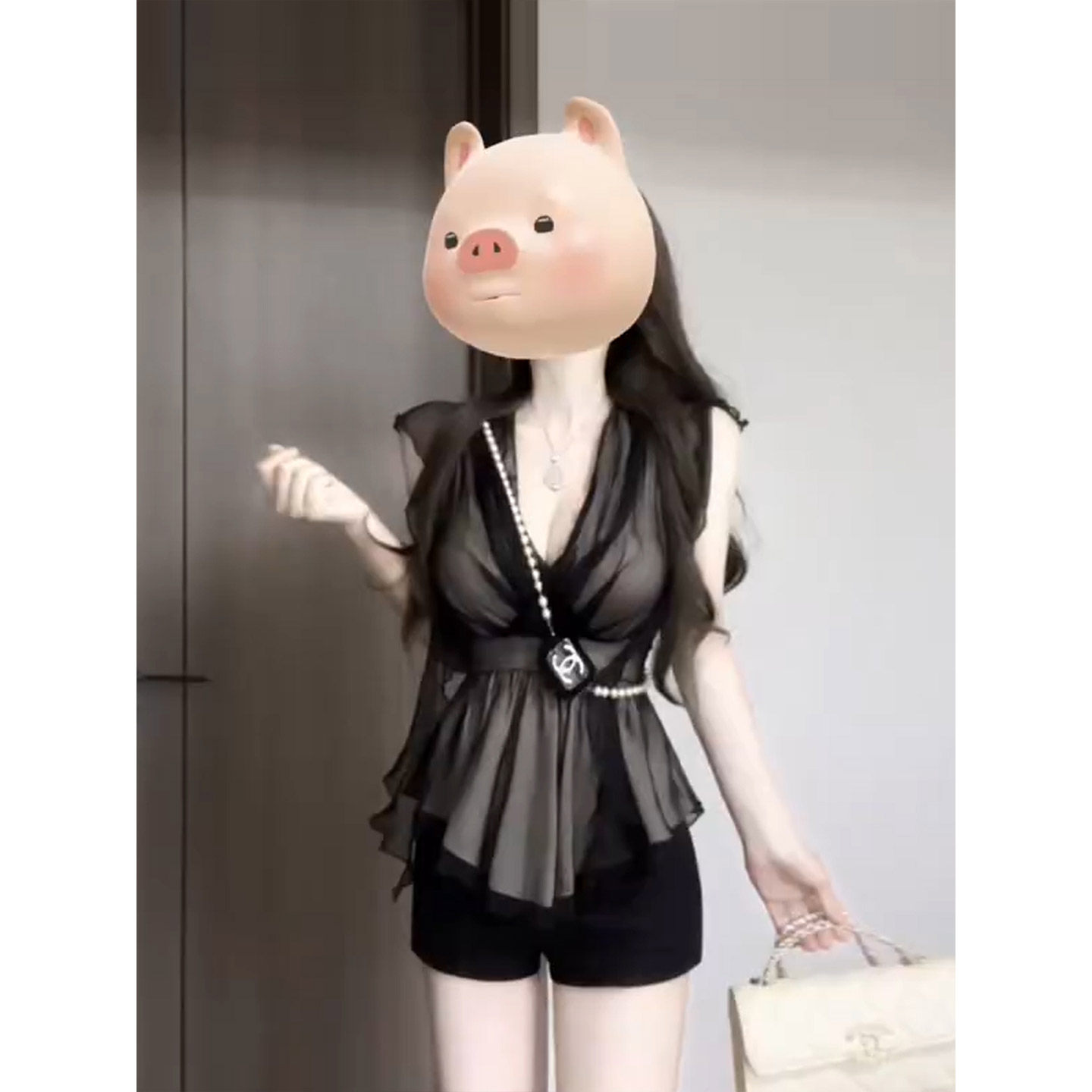 套装 女25年夏黑色高腰短裤 微胖纯欲性感交叉v领垂感飘带衬衫 XZY