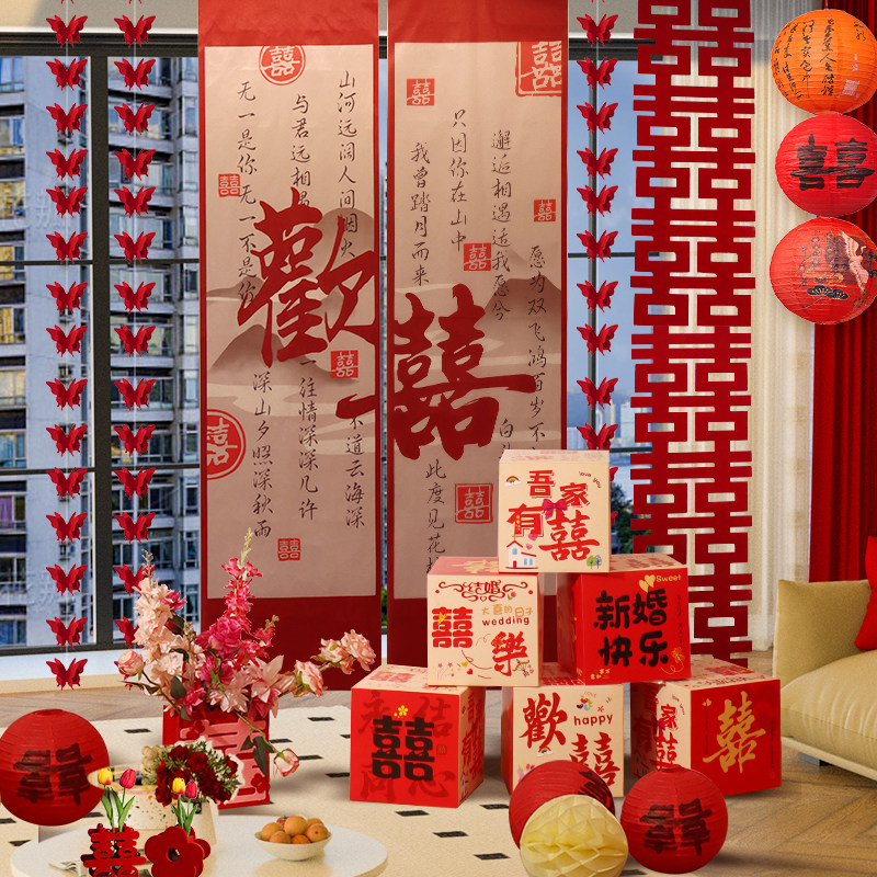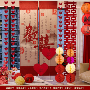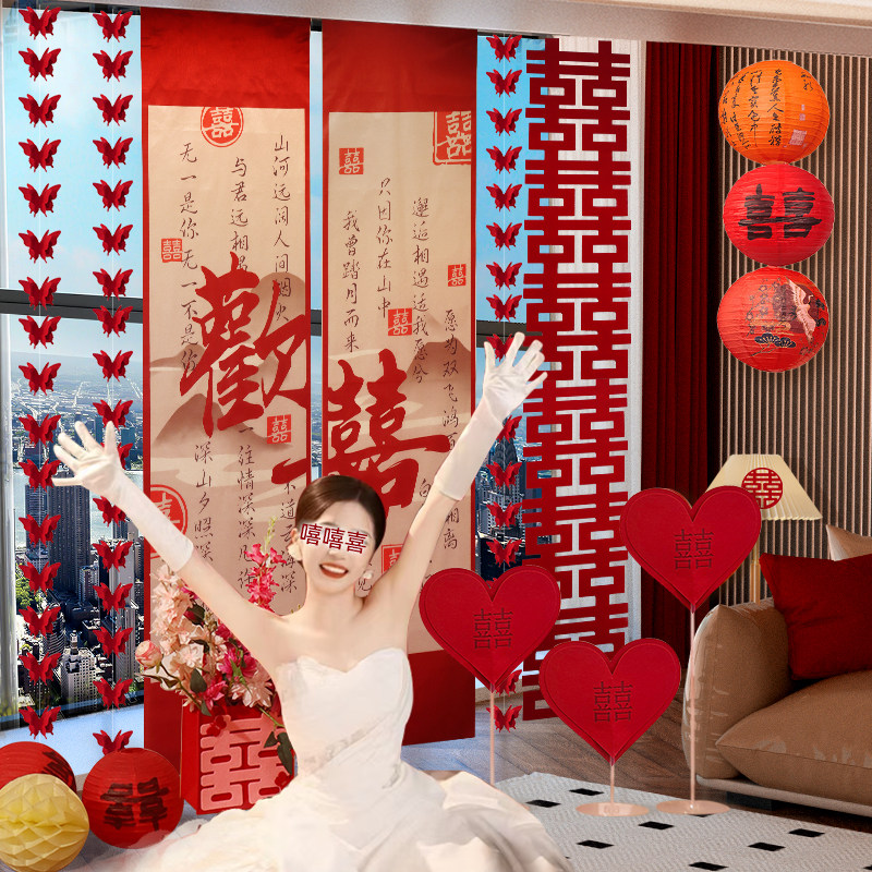 婚房布置套装 饰拉花喜字帘客厅卧室喜庆氛围感背景婚礼订婚 结婚装