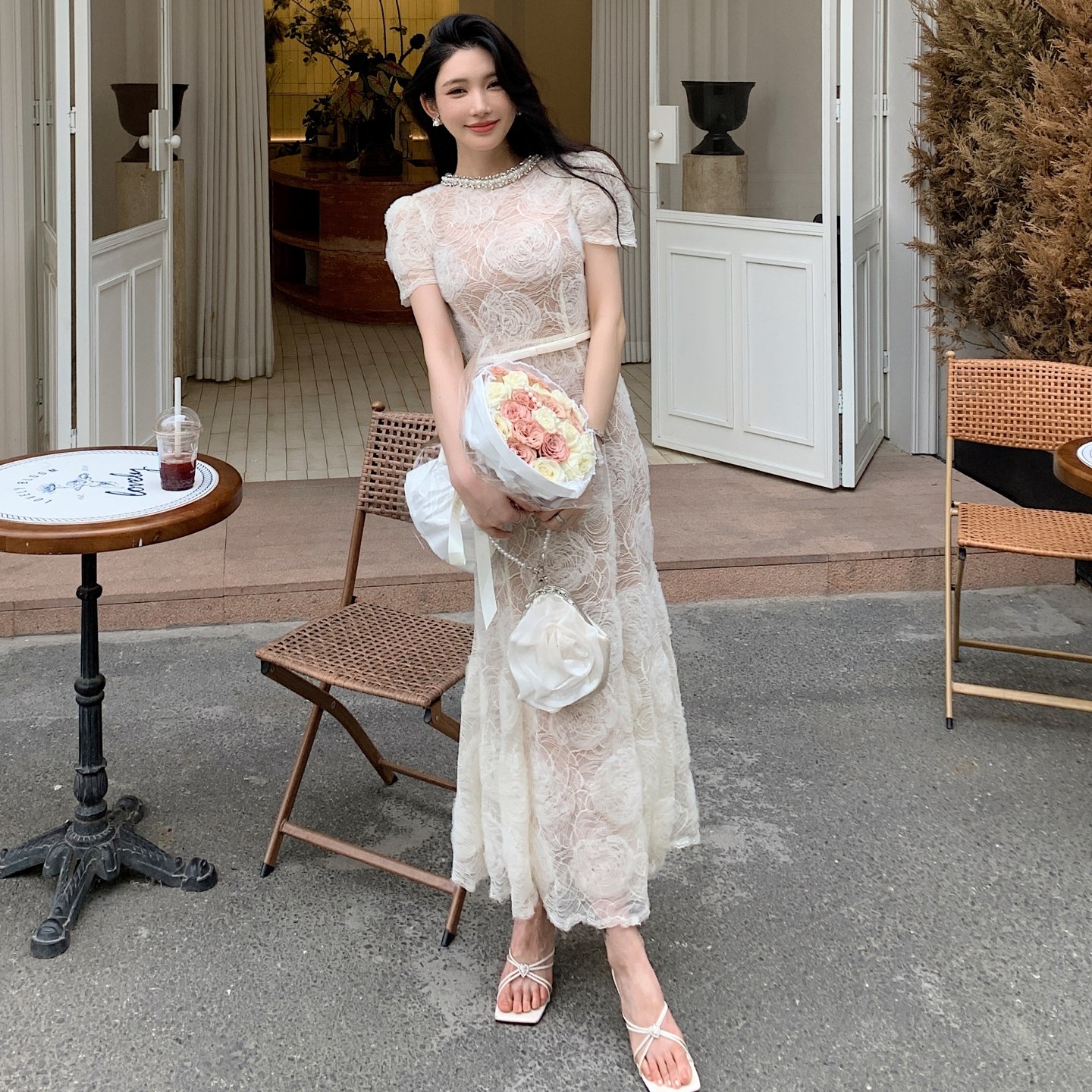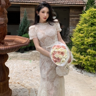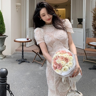 连衣裙今年流行 长款 漂亮裙子 富家千金穿搭盘花蕾丝圆领短袖 法式