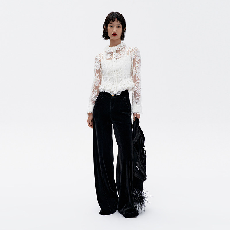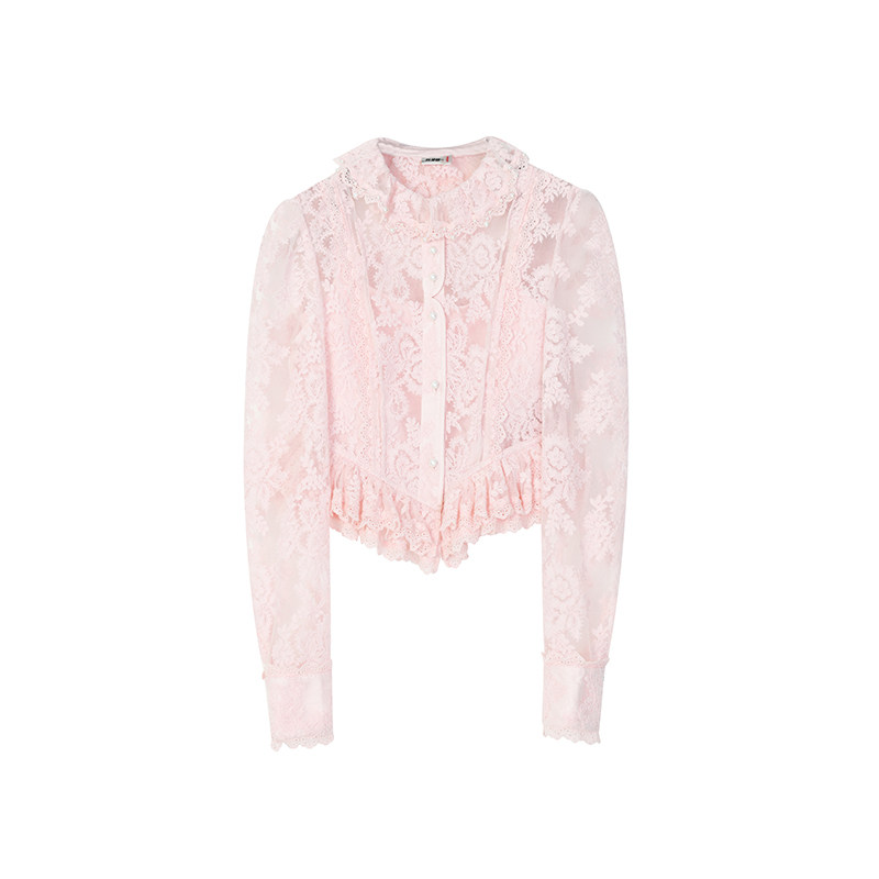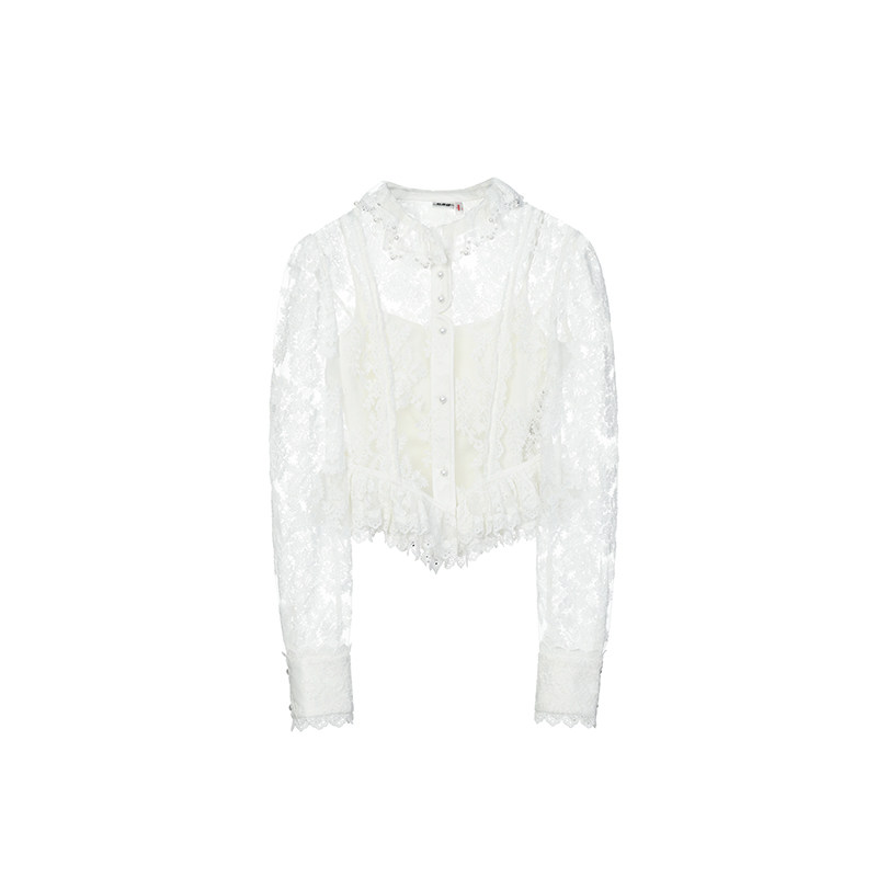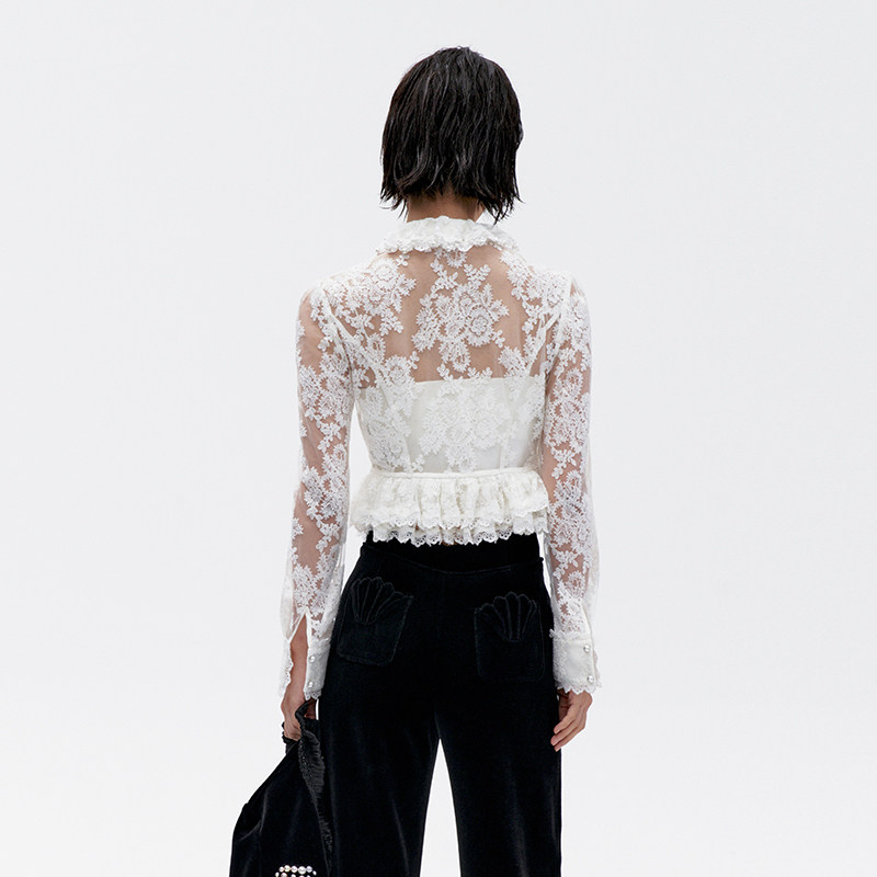 lefame拉飞姆修身 显瘦高级感配内搭 荷叶边蕾丝上衣女网纱修身