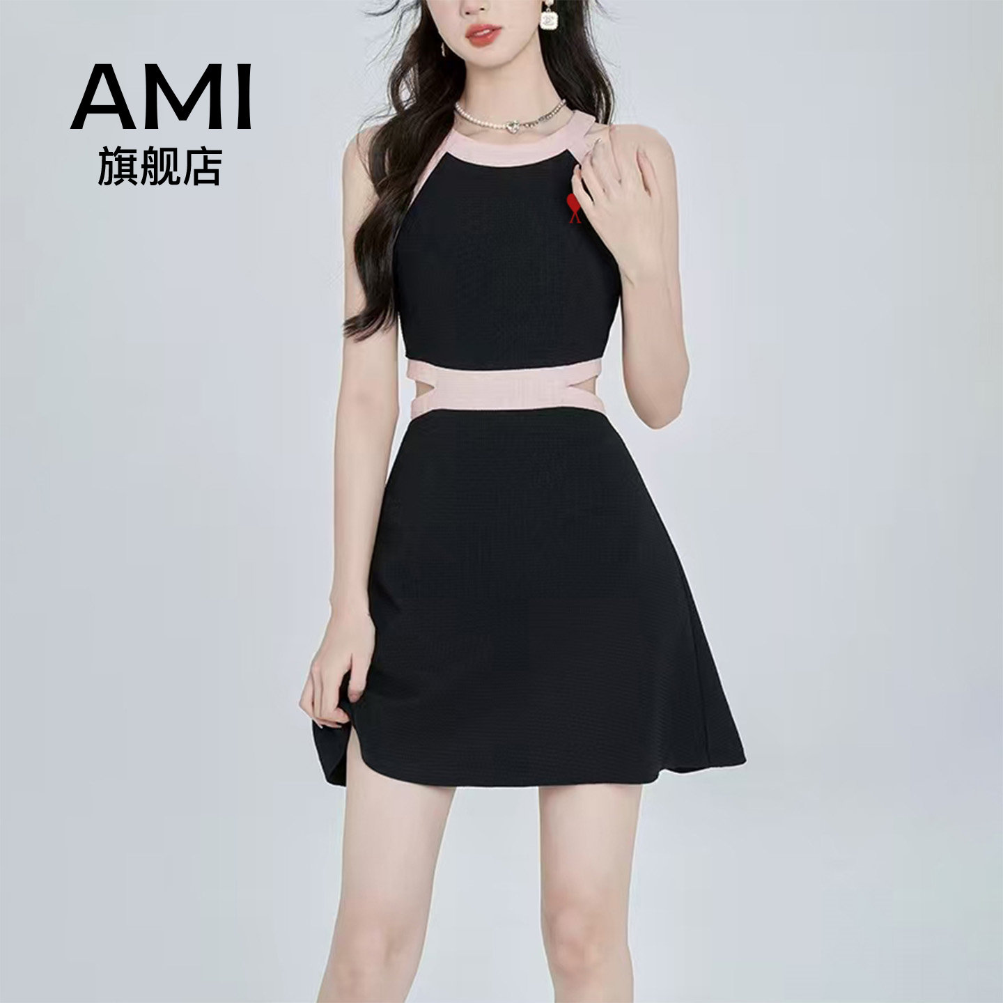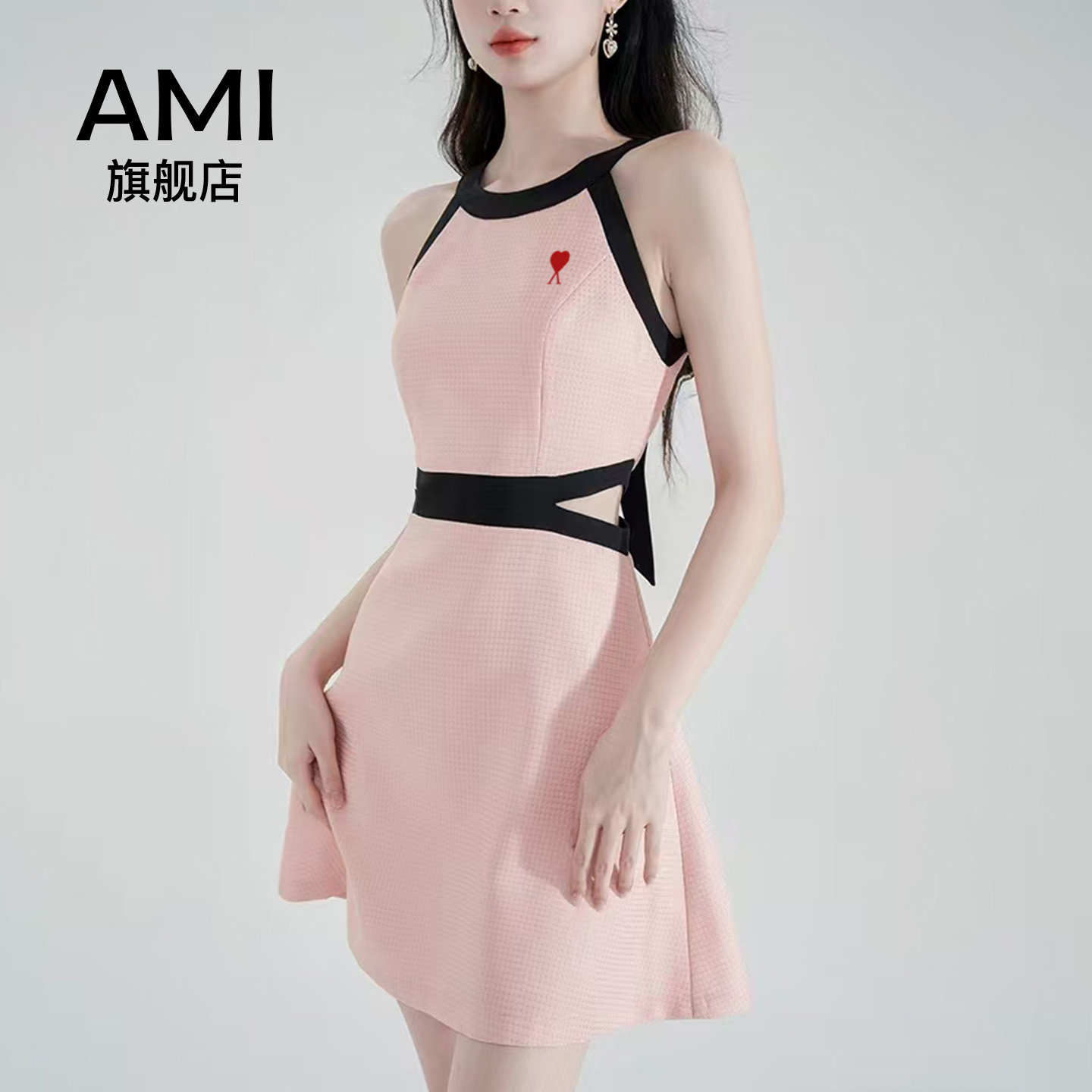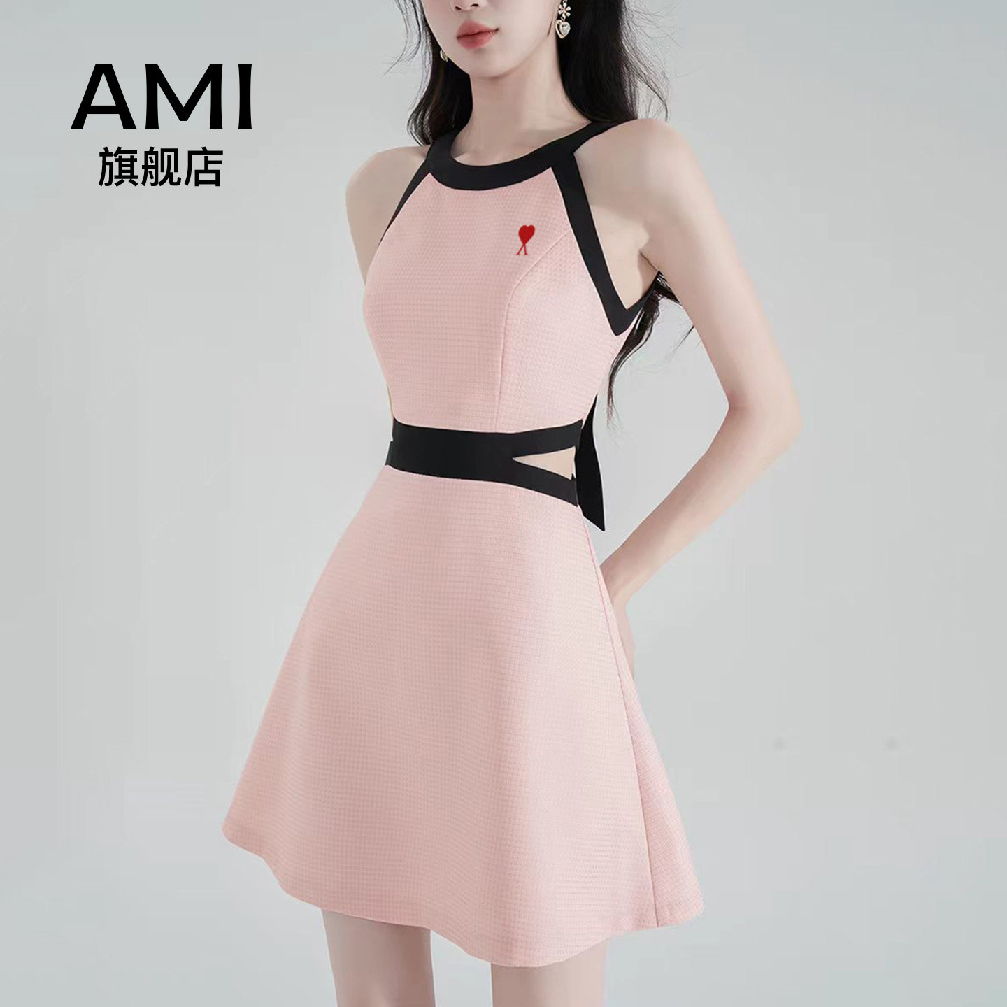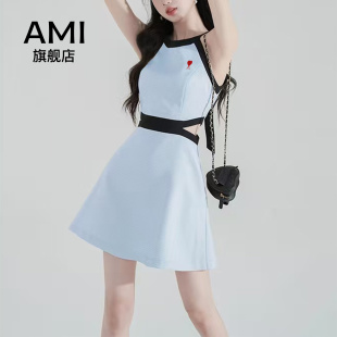 挂脖连衣裙女春正品 粉色无袖 高级感露腰a字吊带 2026美式 AMI官方