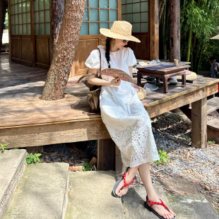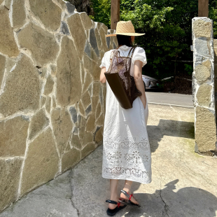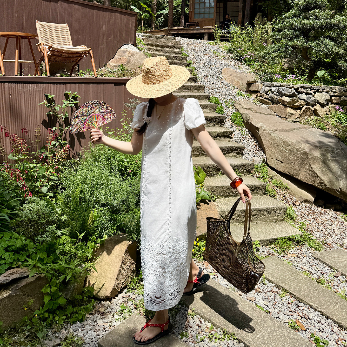 heidy海蒂后背镂空系带白色定位刺绣连衣裙2026春夏纯棉直筒长裙