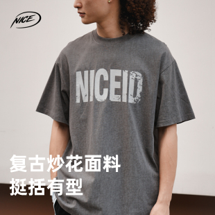 NICEID 印花纯棉复古水洗宽松篮球印花休闲圆领T恤 NICE运动短袖