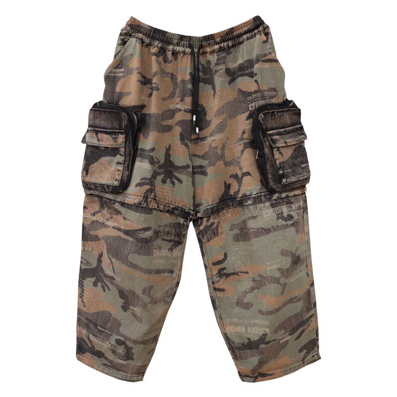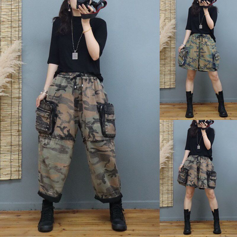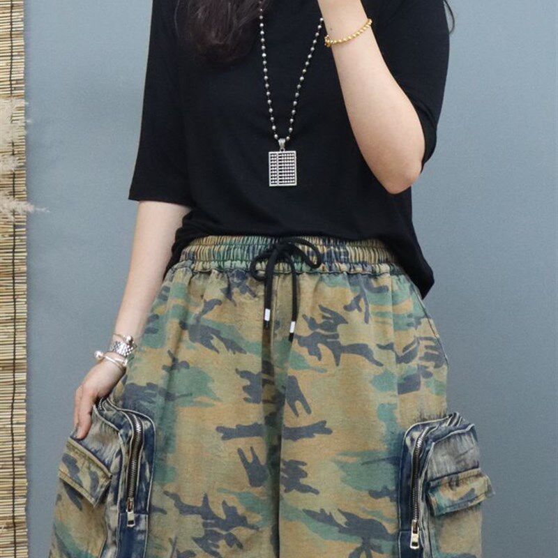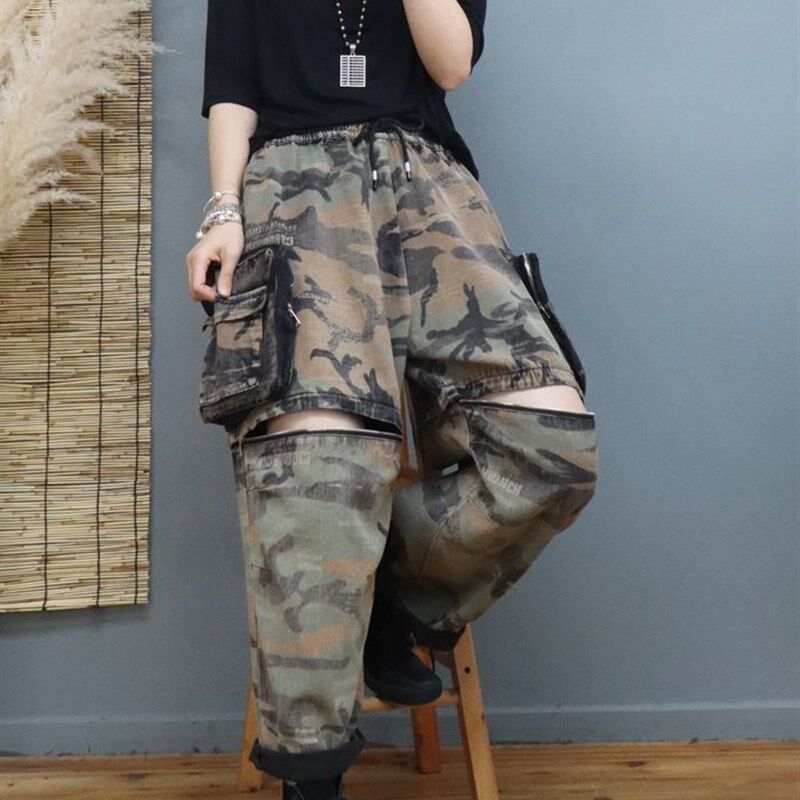 宽松大码 女2022年新款 哈伦长裤 时尚 潮 两穿迷彩牛仔工装 阔腿短裤 裤