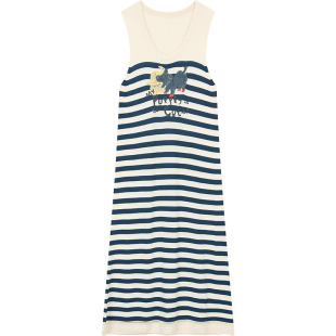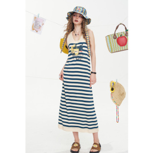 新款 连衣裙女2026夏季 条纹休闲背心裙 口袋原创猫咪印花无袖 妖精